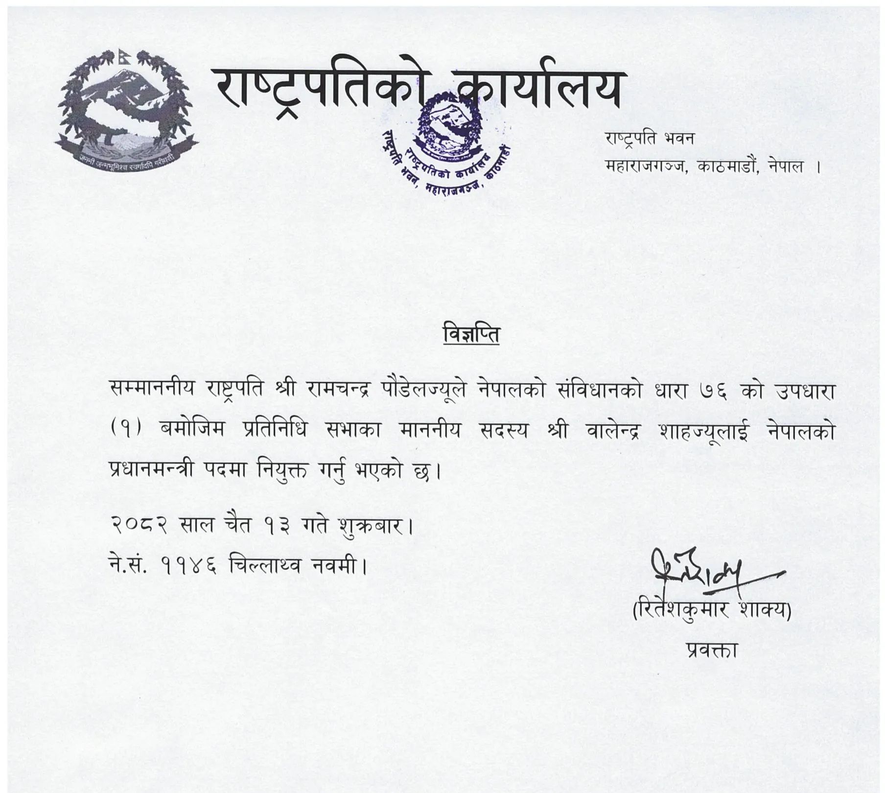 राष्ट्रपति पौडेलले संविधानको धारा ७६ को १ अनुसार प्रतिनिधिसभामा बहुमत प्राप्त दलको नेताको रूपमा उनलाई प्रधानमन्त्री नियुक्त गरेका हुन्।