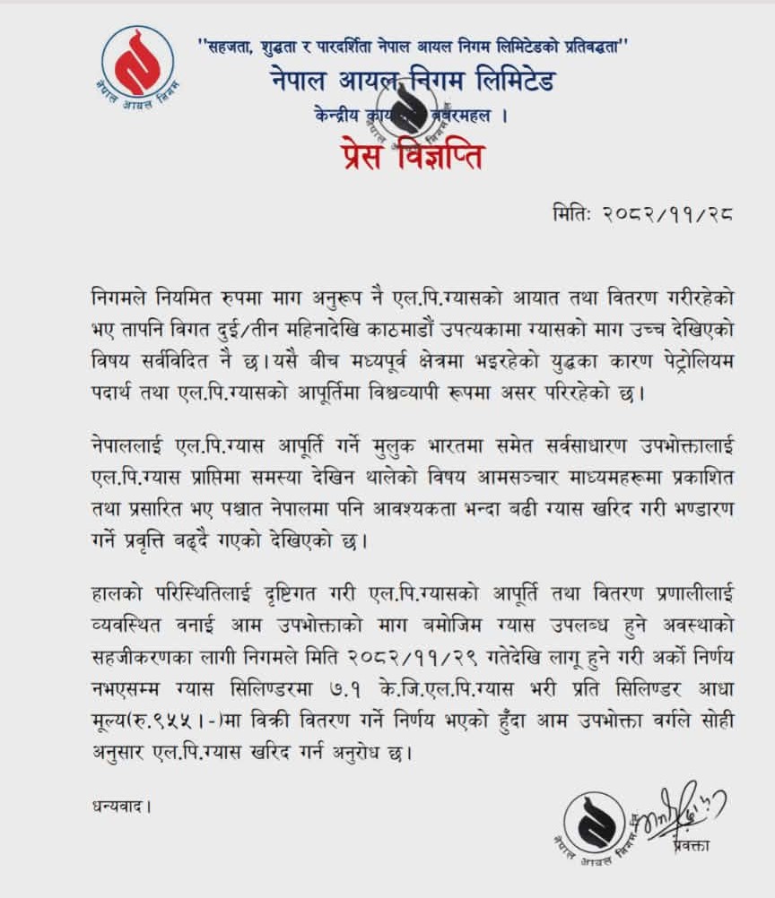 निगमले जनाएअनुसार अर्को निर्णय नभएसम्म ग्यास सिलिन्डरमा ७.१ केजी एलपी ग्यास भरी प्रतिसिलिन्डर ९५५ रुपैयाँमा बिक्री हुनेछ।