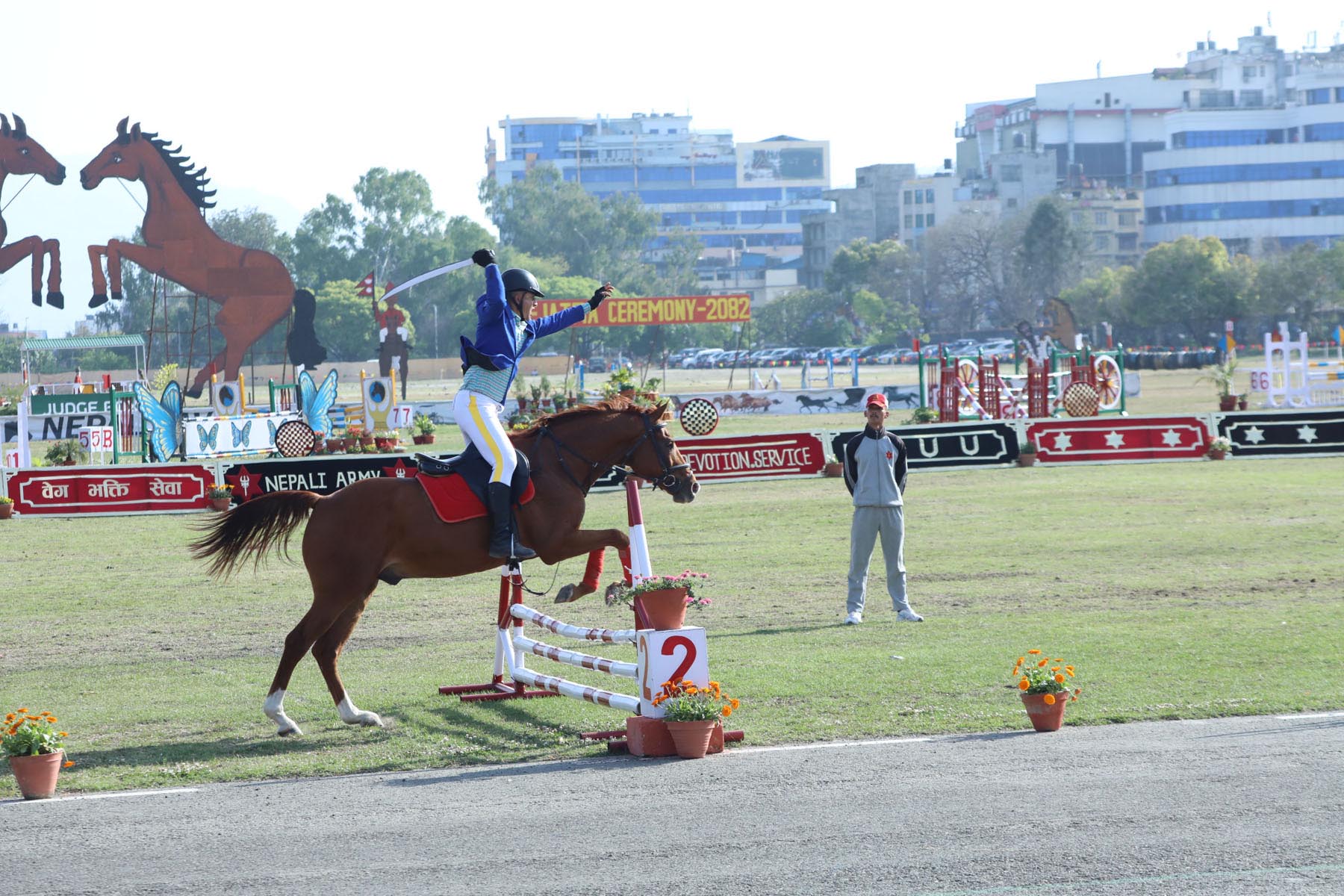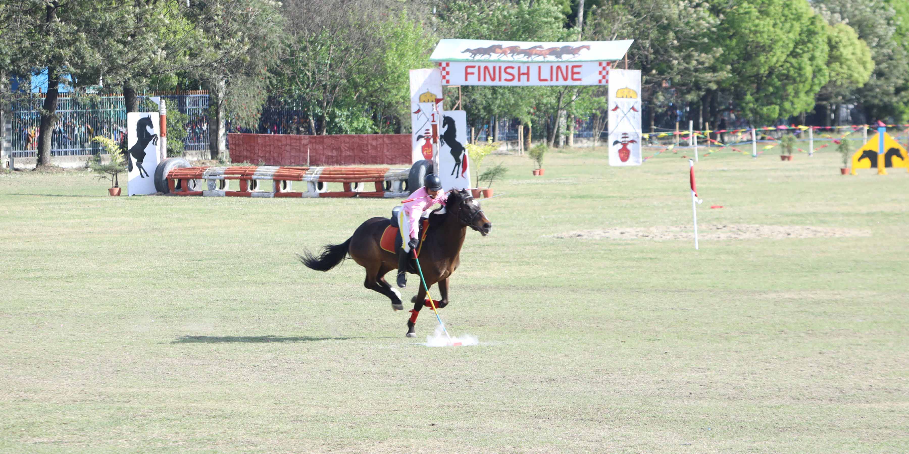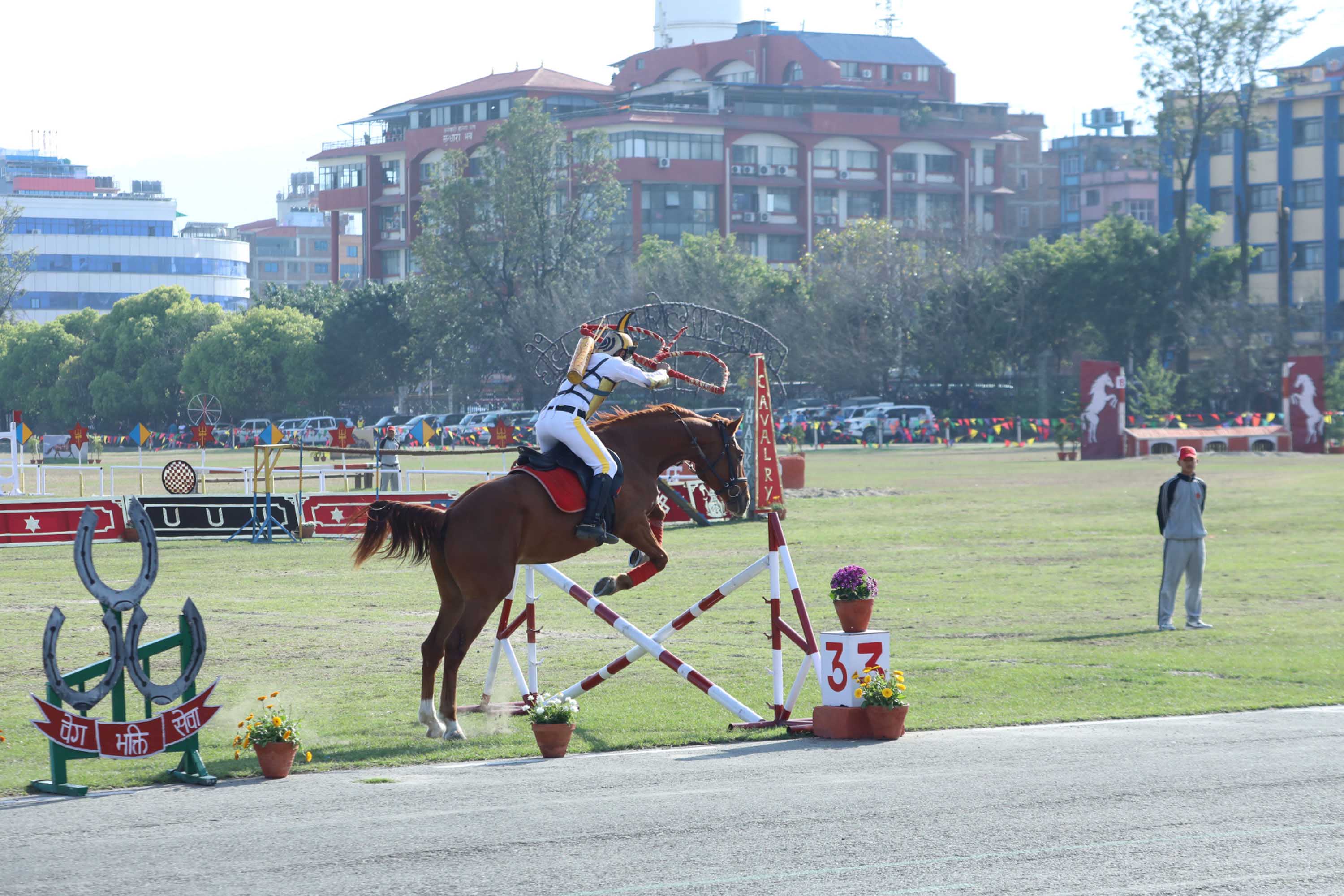 यो प्रस्तुतिमा घोडाहरूले विभिन्न पर्खालहरू नाघेका थिए। साहसिक सेनाहरूले घोडाको चालको गतिमा विभिन्न पर्खालहरू उफ्रेर अगाडि बढेका थिए। यस्तै क्रस टेण्ड पेगिङ अन्तरगतको प्रस्तुतिमा सैनिकहरूले घोडाको सहायता दिँदै शत्रुका टेण्ड भत्काउने शैली प्रस्तुत गरेका थिए। घोडा दौड समेत आयोजना गरिएको थियो।