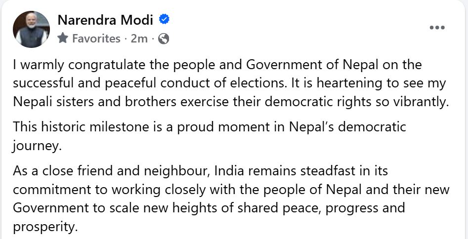 सामाजिक सञ्जालमार्फत आज प्रधानमन्त्री मोदीले नेपाली नागरिकले उत्साहका साथ आफ्नो लोकतान्त्रिक अधिकार प्रयोग गरेको देखेर खुसी लागेको बताएका छन्।