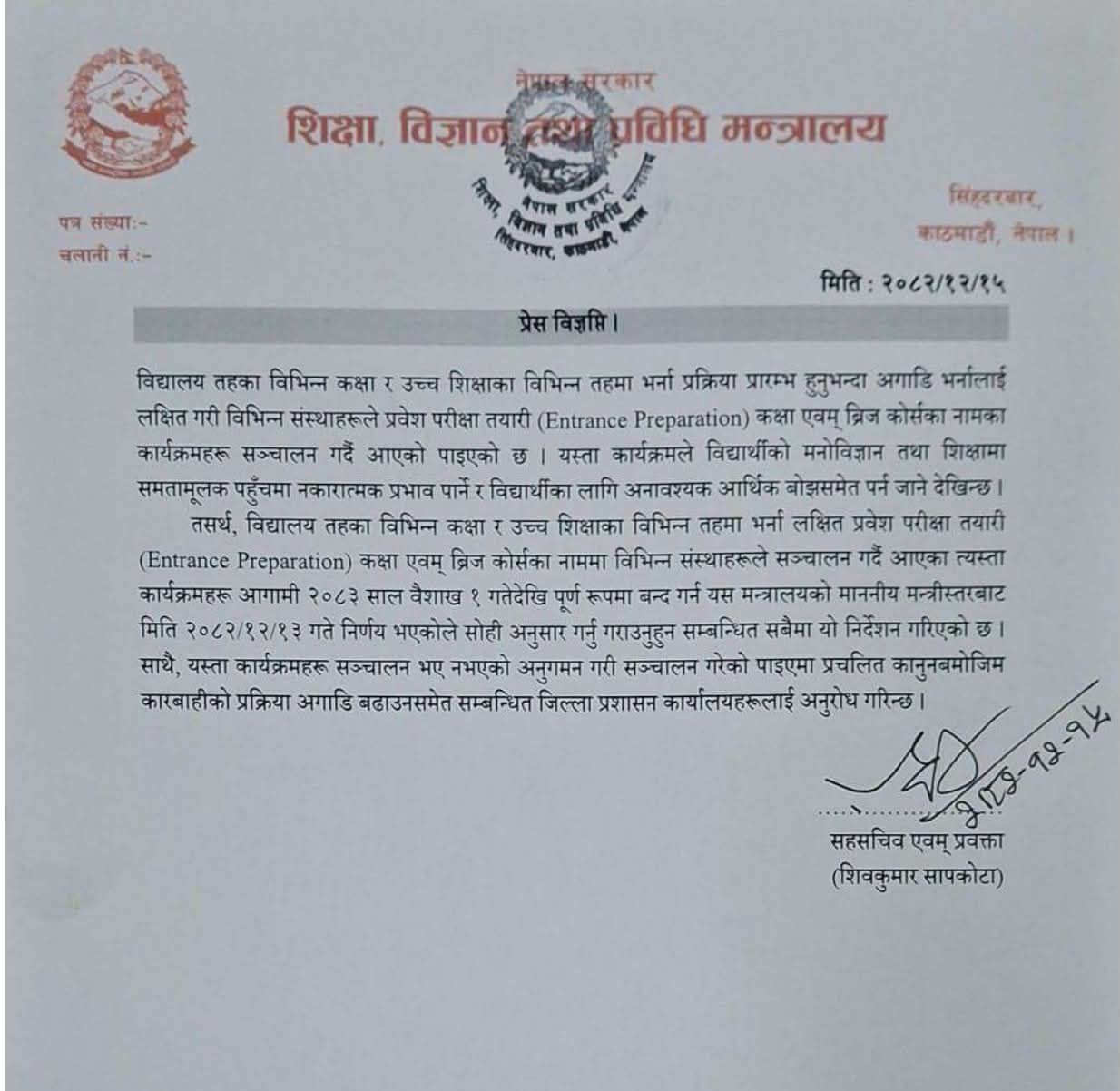 ‘विद्यालय तहका विभिन्न कक्षा र उच्च शिक्षाका विभिन्न तहमा भर्ना लक्षित प्रवेश परीक्षा तयारी कक्षा एवं ब्रिज कोर्सका नाममा विभिन्न संस्थाहरूले सञ्चालन गर्दै आएका त्यस्ता कार्यक्रमहरू अगामी २०८३ साल वैशाख १ गतेदेखि पूर्णरूपमा बन्द गर्न यस मन्त्रालयको माननीय मन्त्रीस्तरबाट मिति २०८२/१२/१३ गते निर्णय भएकोले सोहीअनुसार गर्नु गराउनहुन सम्बन्धित सबैमा यो निर्देशन गरिएको छ,’ सहसचिव एवं प्रवक्ता शिवकुमार सापकोटाले जानरी गरेको विज्ञप्तिमा भनिएको छ।