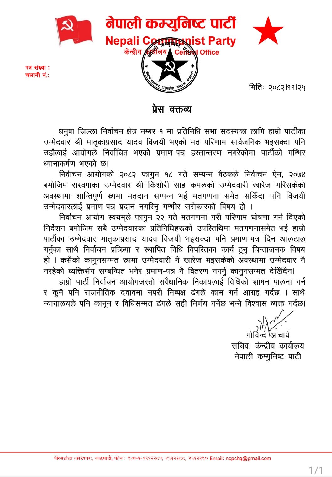पार्टीका उम्मेदवार मातृकाप्रसाद यादव विजयी भइसकेको भन्दै नेकपाले प्रमाणपत्र हस्तान्तरण गर्न नेकपाले आयोगलाई ध्यानाकर्षण गराएको हो।