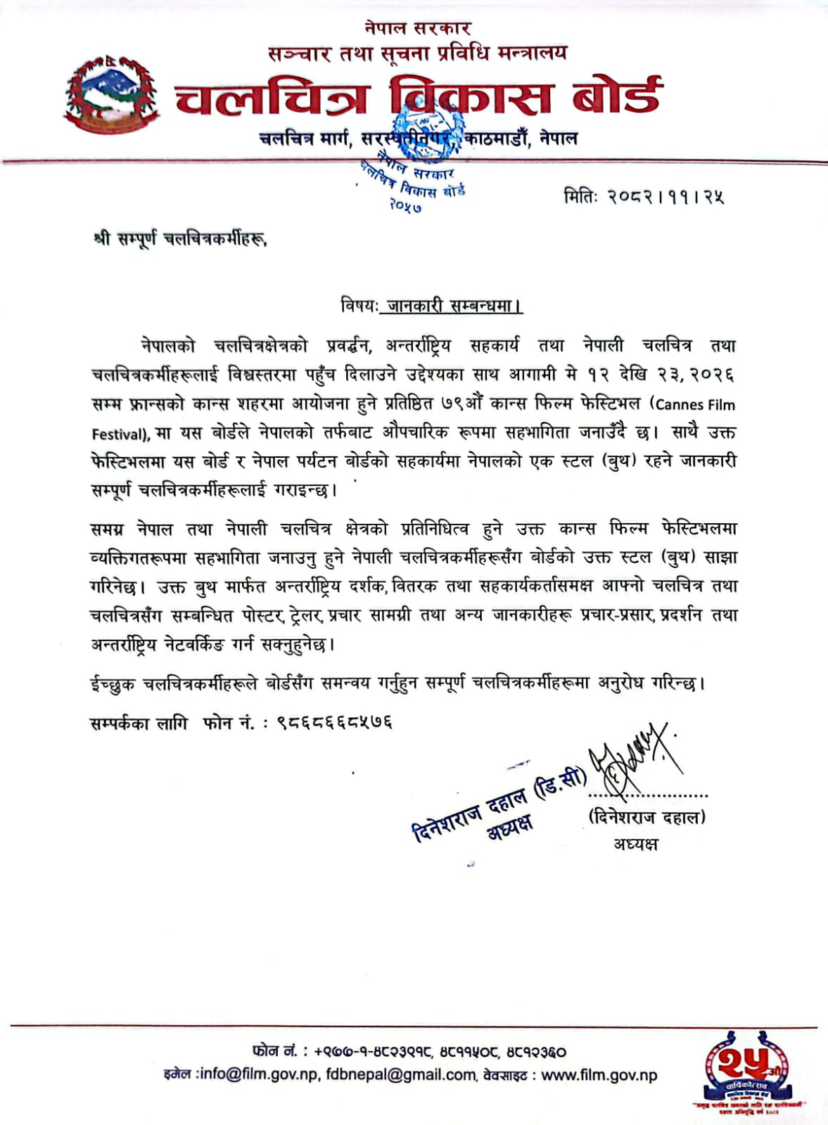 काठमाडौँ- ७९औँ कान्स फिल्म फेस्टिभलमा चलचित्र विकास बोर्डले नेपालको तर्फबाट औपचारिक सहभागिता जनाउने भएको छ।