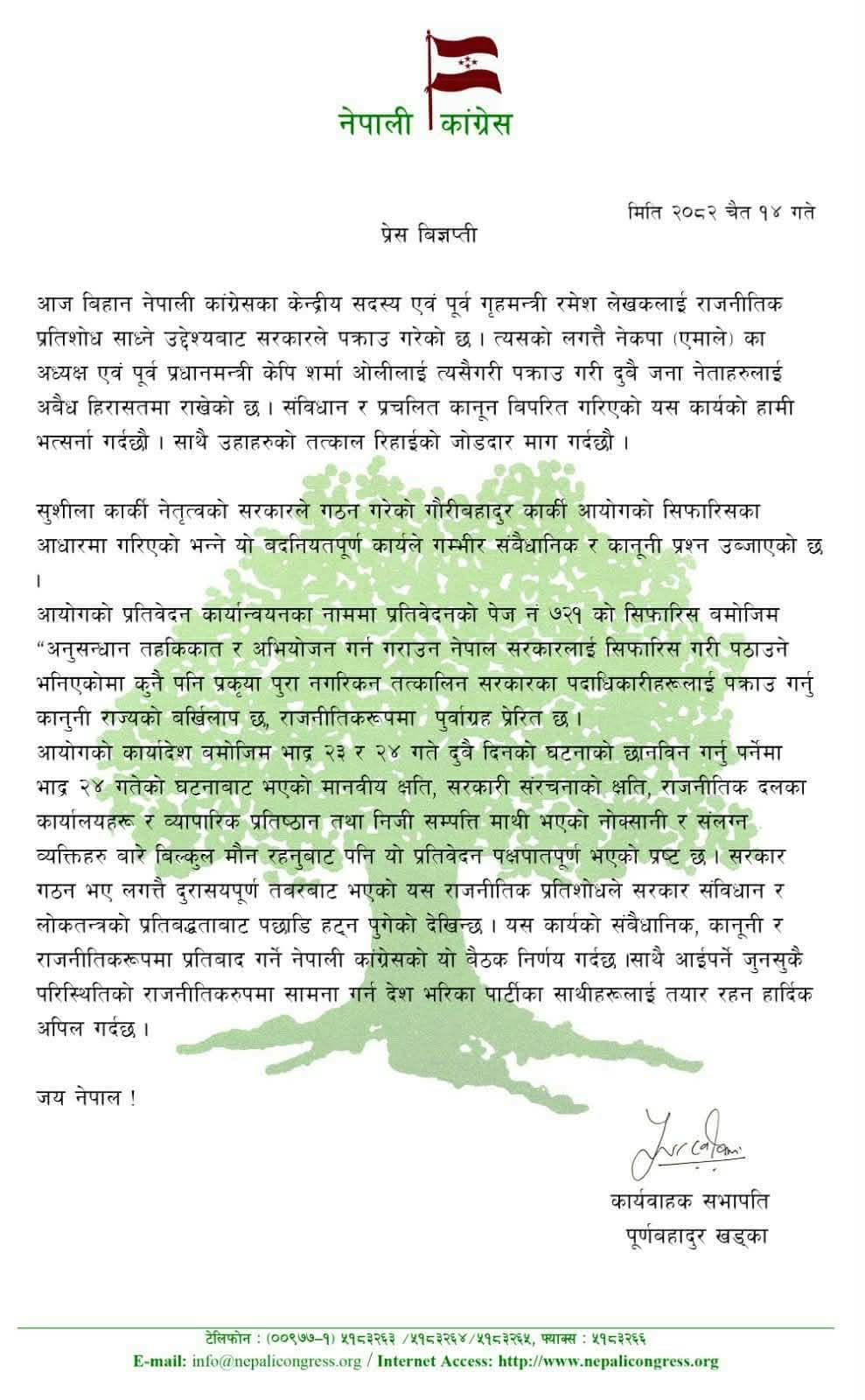ओली र लेखकको पक्राउलाई राजनीतिक प्रतिशोध भन्दै विज्ञप्तिमा तत्काल रिहा गर्न माग गरिएको छ। सुशीला कार्की नेतृत्वको सरकारले गठन गरेको गौरीबहादुर कार्की आयोगको सिफारिसका आधारमा गरिएको भन्ने ‘बदनियतपूर्ण’ कार्यले गम्भीर संवैधानिक र कानुनी प्रश्न उब्जाएको खड्काले जिकिर गरेका छन्।