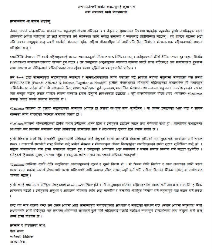 काठमाडौँ- फिल्म ‘लालिमा’ को निर्माण कम्पनी आस्था-फेथले रुपमा राष्ट्रिय स्वतन्त्र पार्टीबाट प्रस्तावित प्रधानमन्त्री बालेन शाहलाई पत्र लेख्दै यौनकर्मी महिलाहरूको मानवधिकार र न्यायबारे सरोकार राख्न आग्रह गरेको छ।
