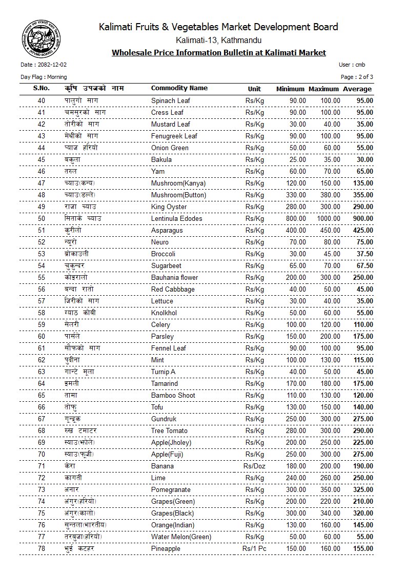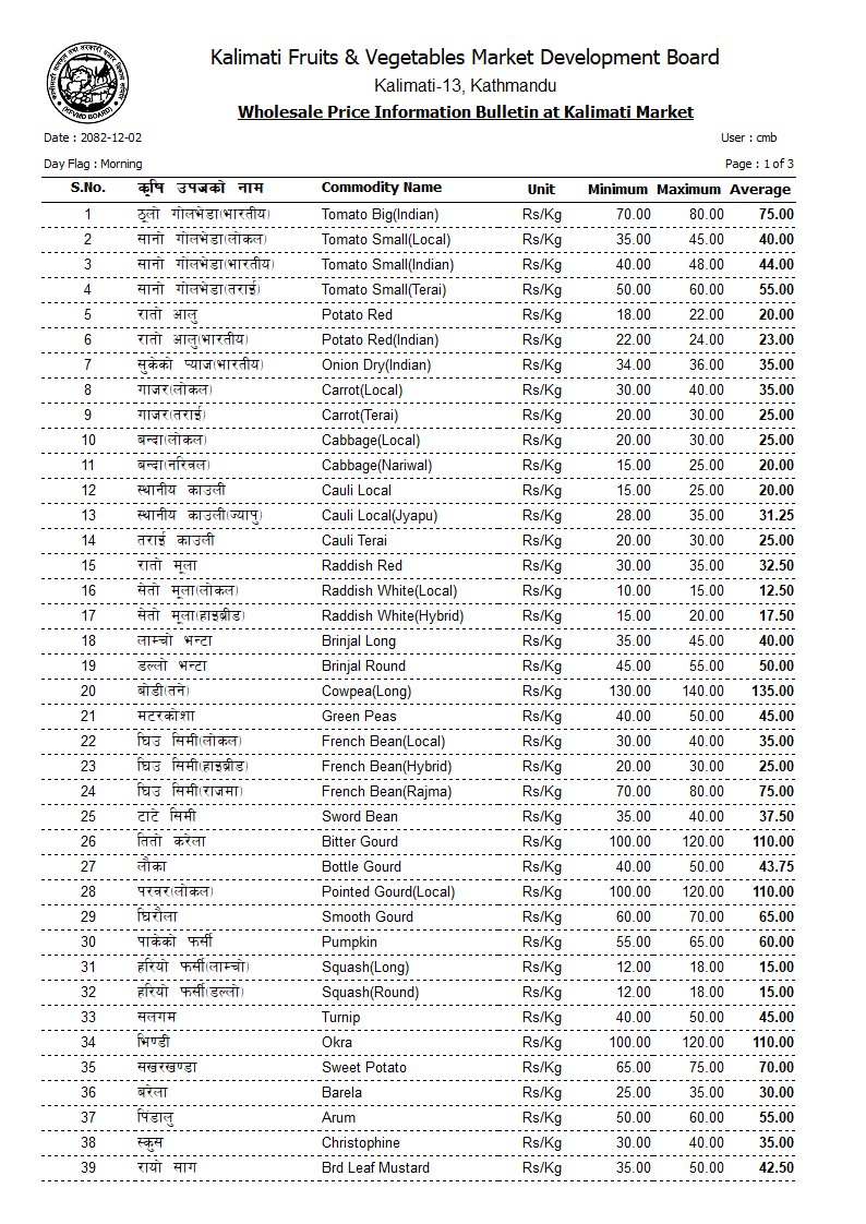 करेला ९५, लौका ६५, घिरौँला ५५, डल्ले फर्सी १५, पाकेको फर्सी ५८, भिन्डी १०५, कन्य च्याउ १४०, डल्ले च्याउ ३७५, सिताके च्याउ ९००, ब्रोकाउली ३२ रुपैयाँ प्रतिकिलो थियो।