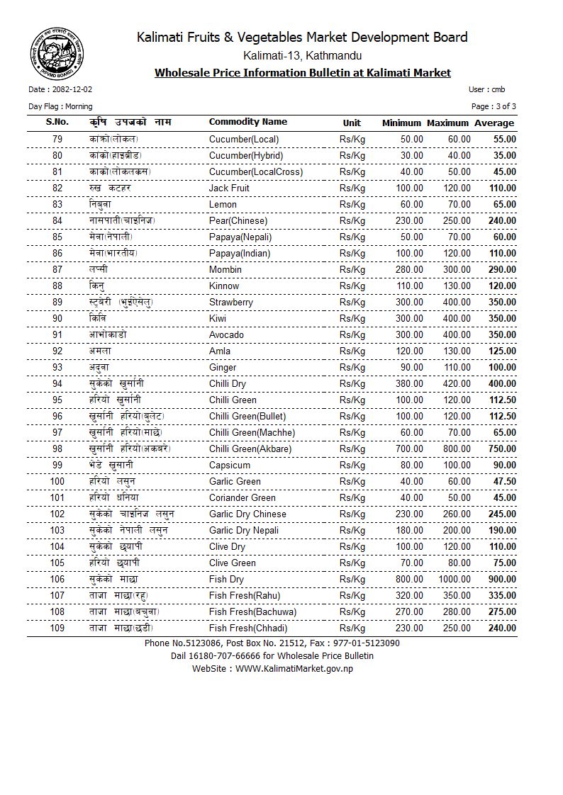 करेला ११०, लौका ४३, घिरौँला ६५, डल्ले फर्सी १५, पाकेको फर्सी ६०, भिन्डी ११०, कन्य च्याउ १३५, डल्ले च्याउ ३५५, सिताके च्याउ ९००, कुरिलो ४२५, ब्रोकाउली ३७ रुपैयाँ प्रतिकिलो छ।