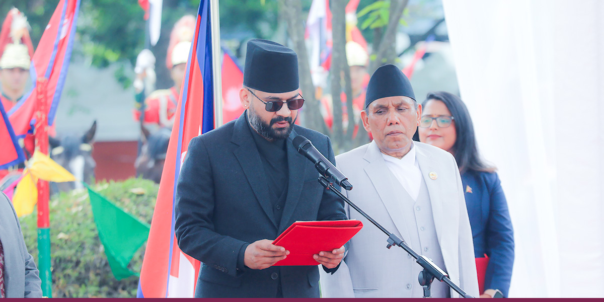 काठमाडौँ- राष्ट्रपतिको कार्यालय शीतल निवासमा आज शंखनाद, वैदिक मन्त्र र बौद्ध पाठको संगमबीच नवनियुक्त प्रधानमन्त्री बालेन्द्र शाहले पद तथा गोपनीयताको शपथ लिए।
