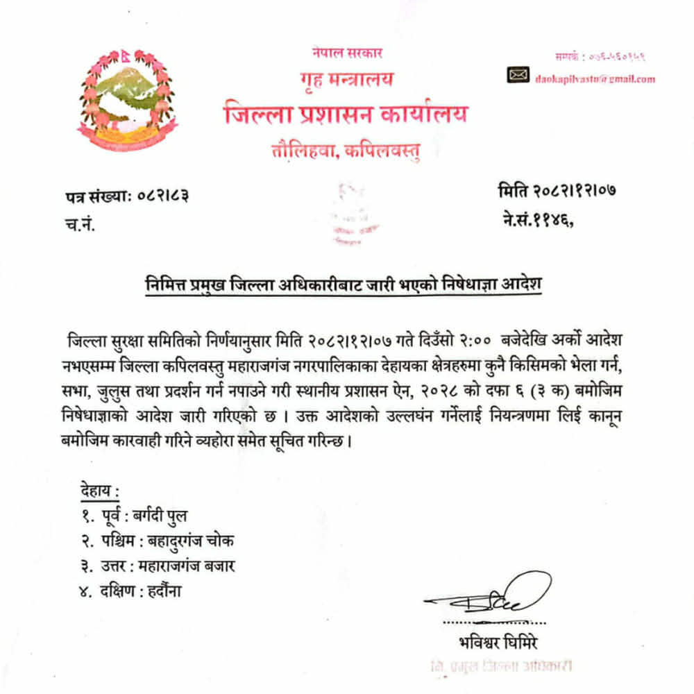 जिल्ला सुरक्षा समितिको निर्णयानुसार शनिबार दिउँसो २ बजेदेखि अर्को आदेश नभएसम्म जिल्ला कपिलवस्तु महाराजगंज नगरपालिकाका पूर्वतर्फ बर्गदी पुल, पश्चिमतर्फ बहादुरगंज चोक, उत्तरतर्फ महाराजगंज बजार र दक्षिणतर्फ हर्दौनामा निषेधाज्ञा जारी गरिएको छ।