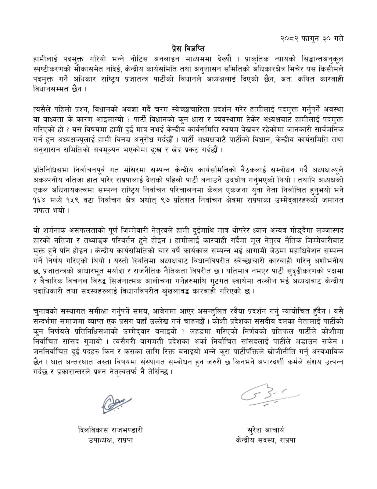 पार्टी नेतृत्वले आफूहरूलाई गैरसंवैधानिक र स्वेच्छाचारी ढंगले पदमुक्त गरेको भन्दै आपत्ति जनाएका छन्। प्राकृतिक न्यायको सिद्धान्तविपरीत स्पष्टीकरणको मौकासमेत नदिई कारबाही गरिएको भन्दै उनीहरूले अध्यक्षको कदमप्रति दुःख र खेद प्रकट गरेका हुन्। एक संयुक्त विज्ञप्ति जारी गर्दै नेताद्वयले आफूहरूलाई पदमुक्त गरिएको जानकारी अनलाइन माध्यमबाट मात्र थाहा पाएको बताएका छन्।