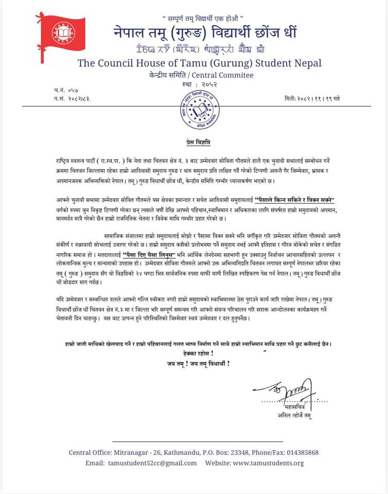 ‘आफ्नो सम्बोधनका क्रममा उम्मेदवार गौतमले यस क्षेत्रका वीर, इमानदार र सचेत आदिवासी समुदायलाई ‘पैसाले किन्न सकिने’ र ‘बिक्न सक्ने वर्ग’ भनी जुन निकृष्ट टिप्पणी गर्नुभएको छ । त्यसले वर्षौंदेखि आफ्नो पहिचान, स्वाभिमान र अधिकारका लागि संघर्षरत आदिवासी जनजाति समुदायको मानमर्दन मात्र गरेको छैन, हाम्रो राजनीतिक चेतना र विवेकमाथि समेत गम्भीर प्रहार गरेको छ’, परिषद् समितिले जारी गरेको विज्ञप्तिमा भनिएको छ ।