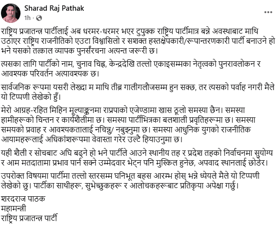 ‘त्यसका लागि पार्टीको नाम, चुनाव चिह्न, केन्द्रदेखि तल्लो एकाइसम्मका नेतृत्वको पुनरावलोकन र आवश्यक परिवर्तन अत्यावश्यक छ’, महामन्त्री पाठकले लेखेका छन्।