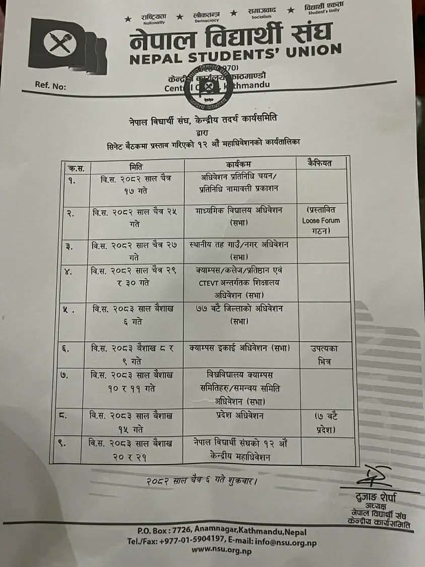 काठमाडौँ- नेपाली कांग्रेसको भ्रातृ संस्था नेपाल विद्यार्थी संघ (नेविसंघ) को महाधिवेशन हुने भएको छ। शुक्रबार नेविसंघको सिनेट बैठकमा नयाँ नेतृत्व चयन गर्न महाधिवेशनको प्रस्ताव पेस भएको हो।