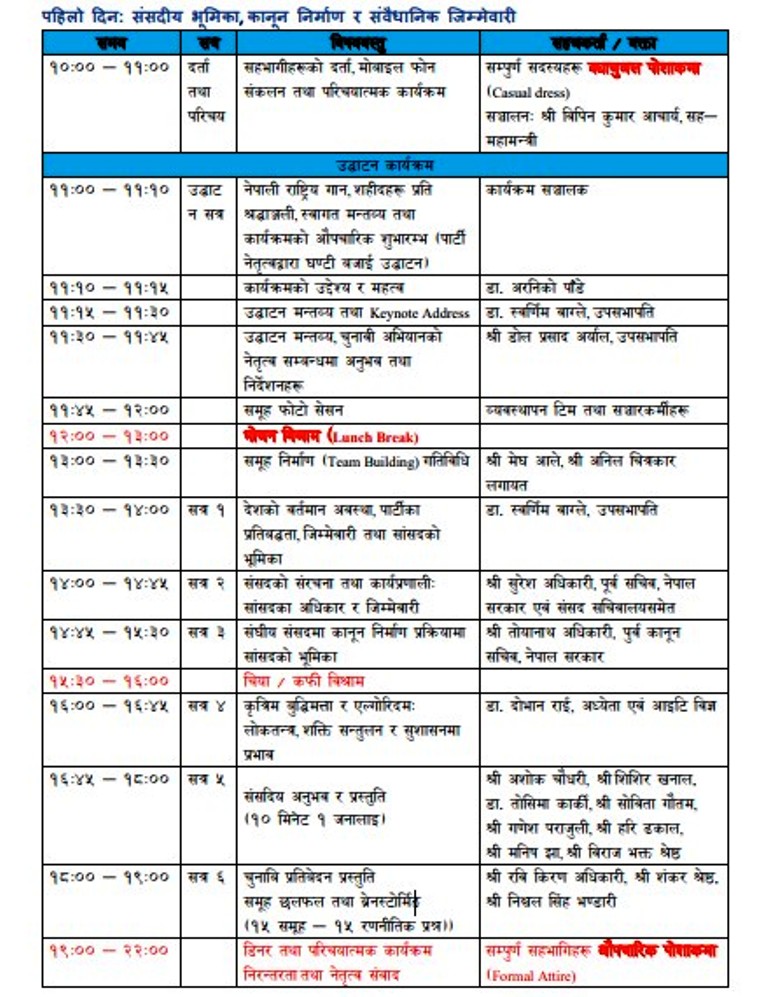 १ बजेर ३० मिनेटदेखि २ बजेसम्म आधा घण्टा पुनः उपसभापति स्वर्णिम वाग्लेले देशको वर्तमान अवस्था, पार्टीका प्रतिबद्धता, जिम्मेवारी तथा संसदको भूमिकाबारे प्रस्तुति दिनेछन् । दिउँसो २ बजेपछि ४५ मिनेट संसदको संरचना तथा कार्यप्रणाली : संसदका अधिकार र जिम्मेवारीको विषयमा पूर्वसचिव सुरेश अधिकारीको प्रस्तुति रहने छ ।