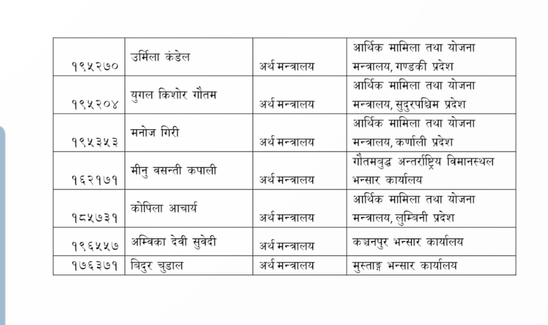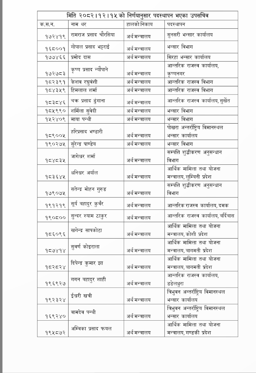अर्थमन्त्री डा. स्वर्णिम वाग्लेले आइतबार मन्त्रीस्तरीय निर्णय गरेर उपसचिवहरुको सरूवा गरेका हुन्।