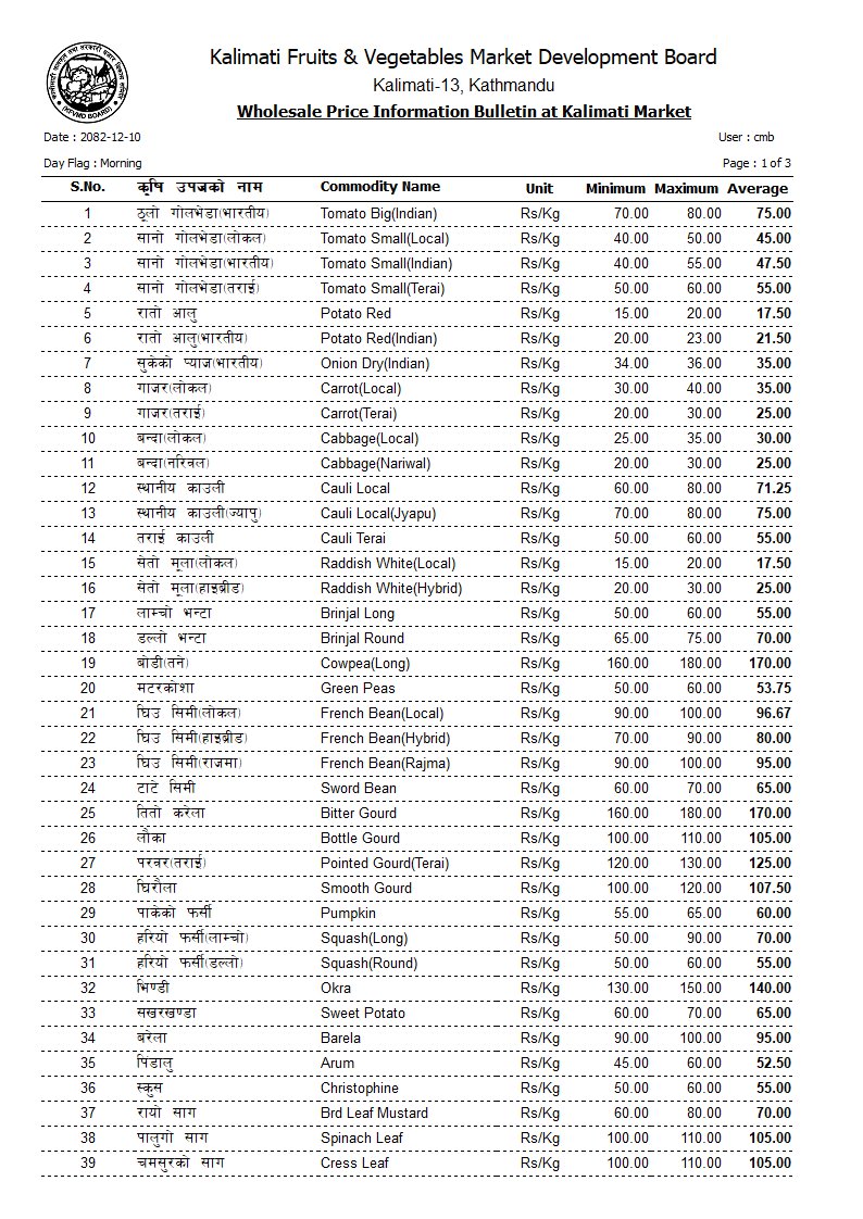 कालिमाटीमा हिजो ठूलो भारतीय गोलभेँडा ७५, सानो लोकल गोलभेँडा ४५, रातो आलु १८, भारतीय आलु २२, भारतीय सुकेको प्याज ३५, तराईको गाँजर २५, लोकल बन्दा ३०, स्थानीय काउली ९०, लाम्चो भन्टा ५५, डल्ले भन्टा ५५, लोकल मुला १७ रुपैयाँ प्रतिकिलो थियो।