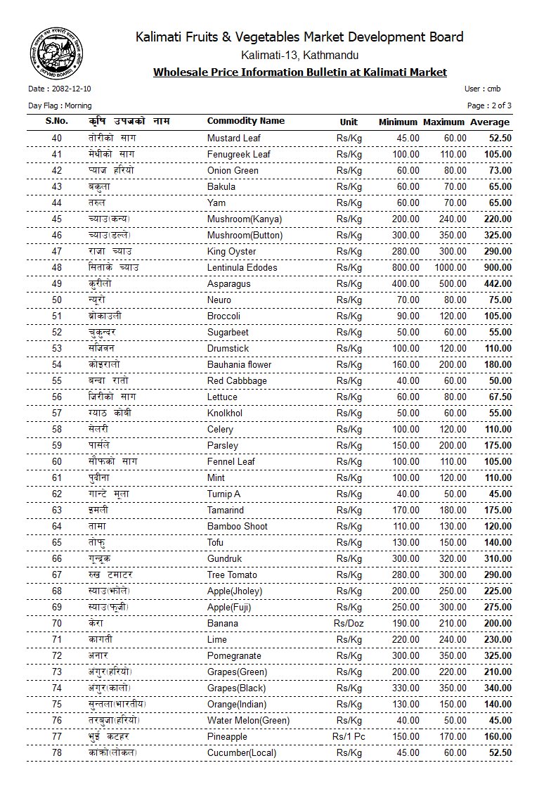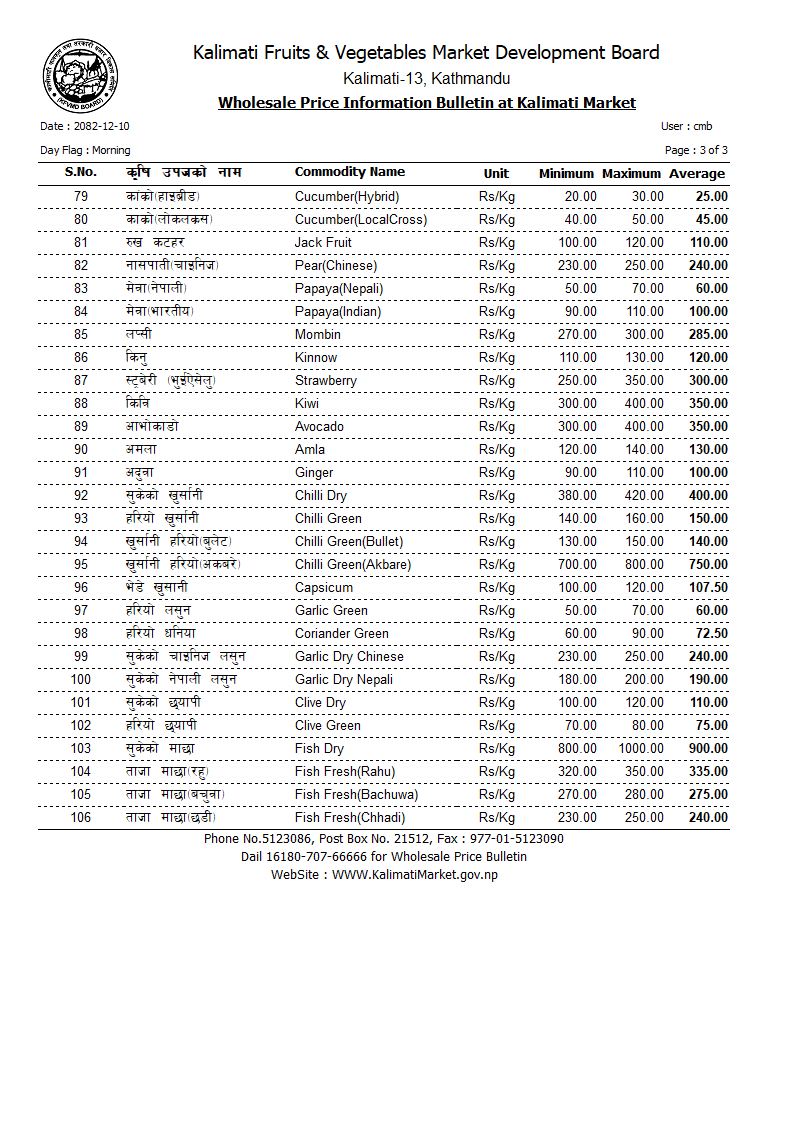तनेबोडी १७०, करेला १७०, लौका १०५, घिरौँला १०७, डल्ले फर्सी ५५, पाकेको फर्सी ६०, भिन्डी १४०, कन्य च्याउ २२०, डल्ले च्याउ ३२५, सिताके च्याउ ९००, कुरिलो ४४२, न्यूरो ७५, ब्रोकाउली १०५ रुपैयाँ प्रतिकिलो छ।