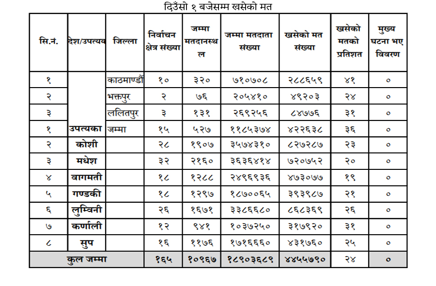 १ बजेसम्मको अवधिमा ४४ लाख ५५ हजार ७९० मत खसेको निर्वाचन आयोगले जनाएको छ। सबैभन्दा बढी काठमाडौँ उपत्यकामा ३६ प्रतिशत मत खसेको आयोगको तथ्यांक छ।