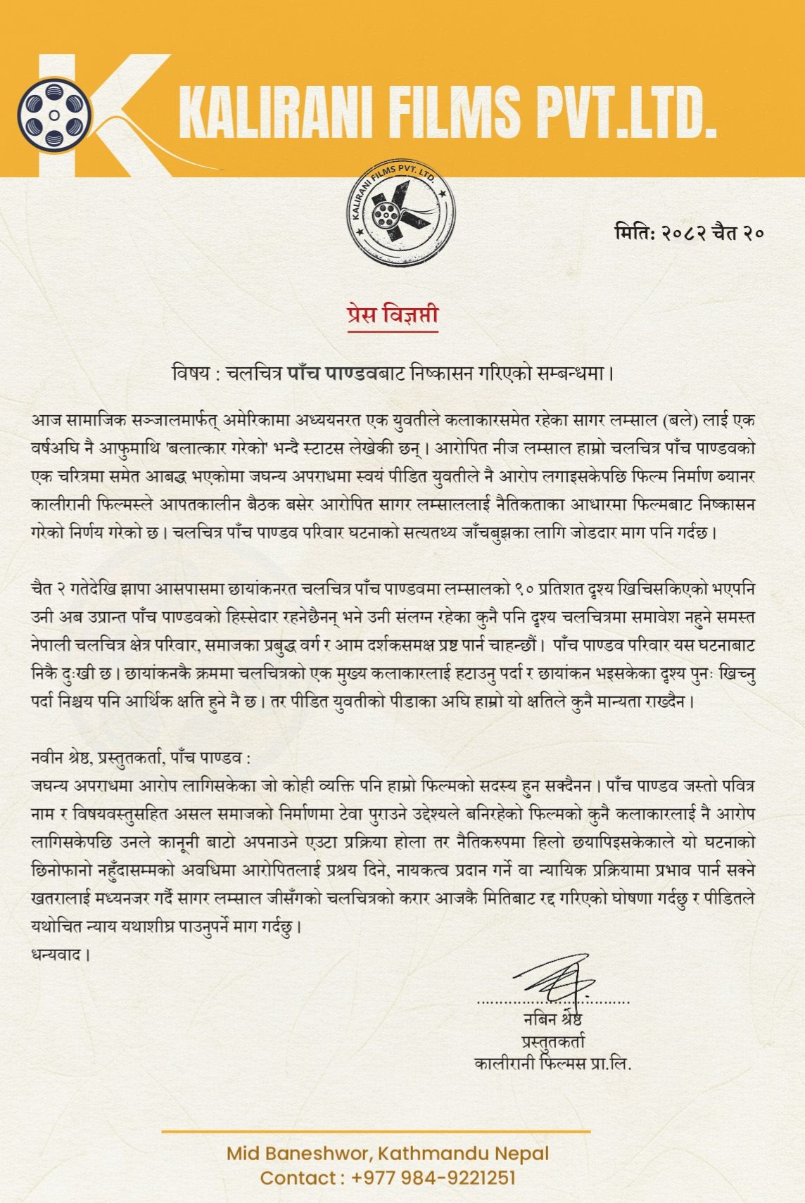 छायांकनकै क्रममा फिल्मबाट मुख्य कलाकार हटाउनुपरेकाे भन्दै कम्पनीका प्रस्तुतकर्ता नवीन श्रेष्ठले सम्बन्धित निकायलाई घटनाकाे सत्य तथ्य जाँच्नसमेत माग गरेका छन्।