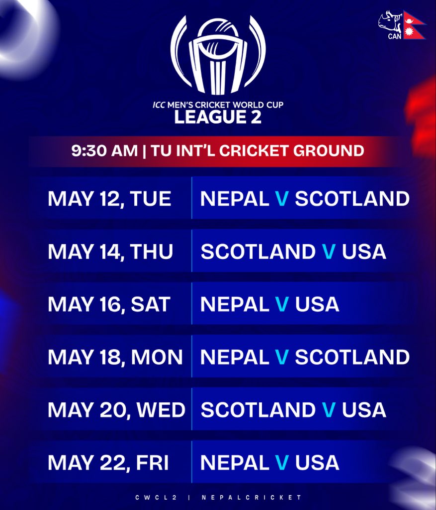 नेपालले मे १२ र मे १८ मा स्कटल्याण्डसँग खेल्नेछ भने मे १६ र मे २२ मा अमेरिकासँग प्रतिस्पर्धा गर्नेछ। यसै गरी अमेरिका र स्कटल्याण्डबीच मे १४ र मे २० मा खेल हुनेछ।