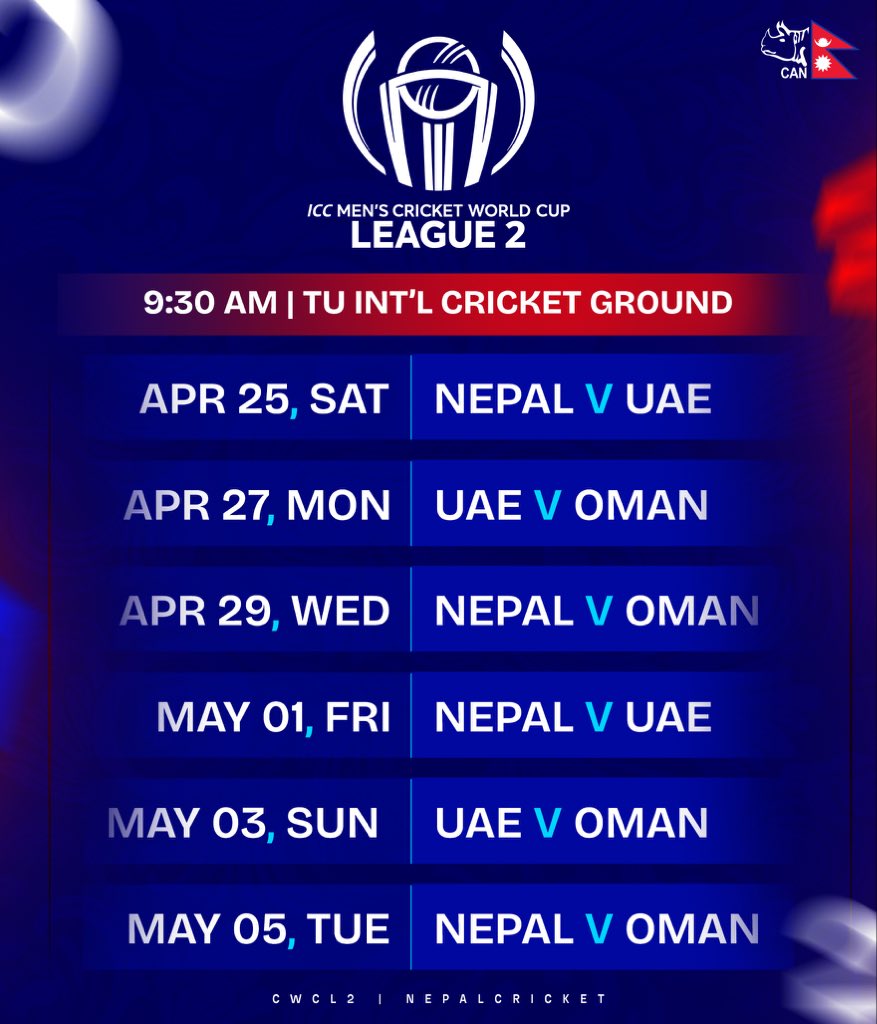 काठमाडौँ- नेपाल क्रिकेट संघ (क्यान) ले नेपाल, ओमान र संयुक्त अरब इमिरेट्स (यूएई) तथा नेपाल, स्कटल्याण्ड र अमेरिका सम्मिलित आईसीसी पुरुष क्रिकेट विश्वकप लिग २ अन्तर्गतका दुईवटा त्रिकोणात्मक शृङ्खलाको तालिका सार्वजनिक गरेको छ।