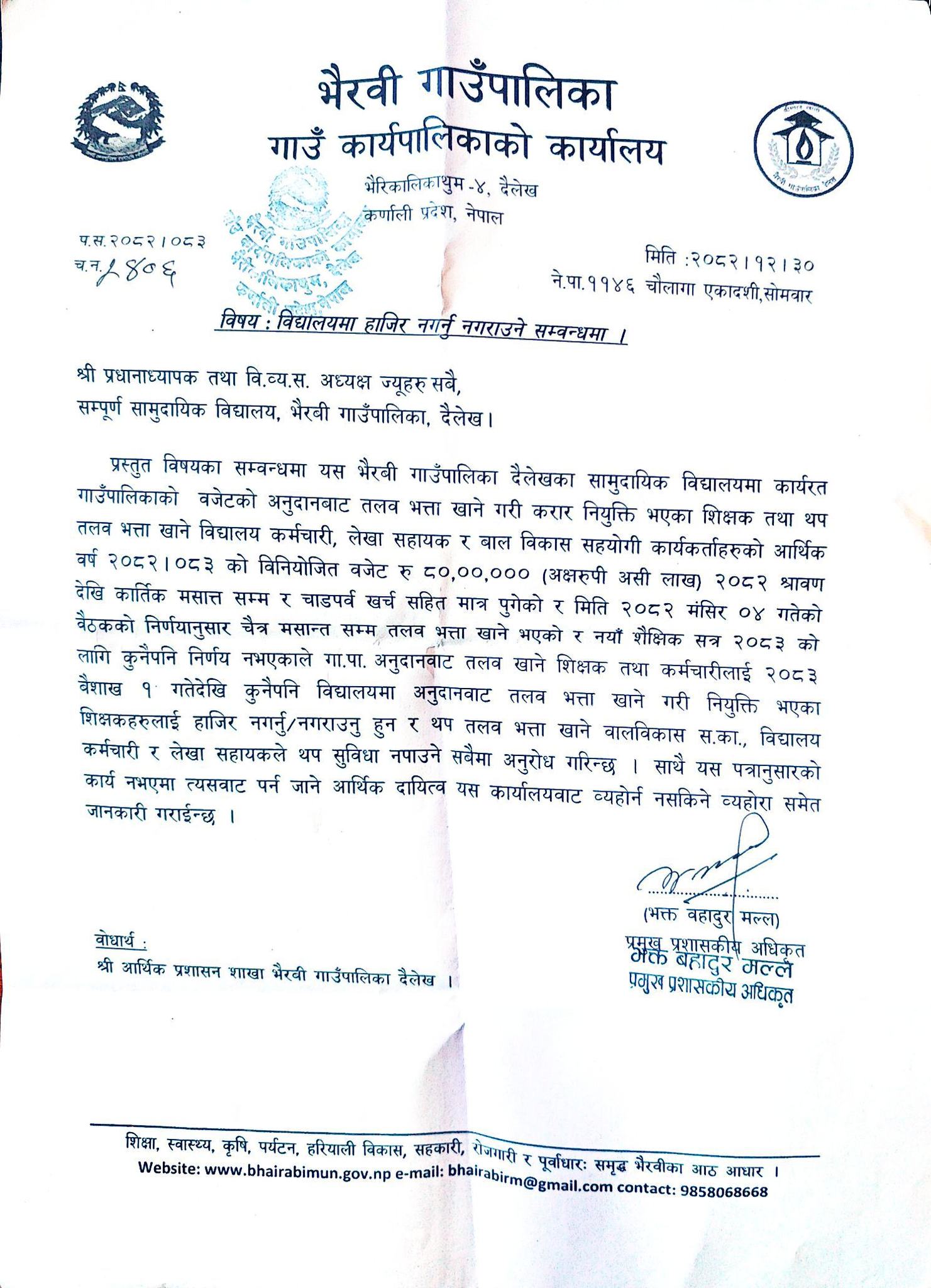 पत्रमा भनिएको छ, ‘२०८३ वैशाख १ गतेदेखि कुनै पनि विद्यालयमा अनुदानबाट तलब भत्ता खाने गरी नियुक्ति भएका शिक्षकलाई हाजिर नगर्नु नगराउनु हुन र थप तलब भत्ता खाने बालविकास सहयोगी कार्यकर्ता, विद्यालय कर्मचारी र लेखा सहायकले थप सुविधा नपाउने सबैमा अनुरोध गरिन्छ।’