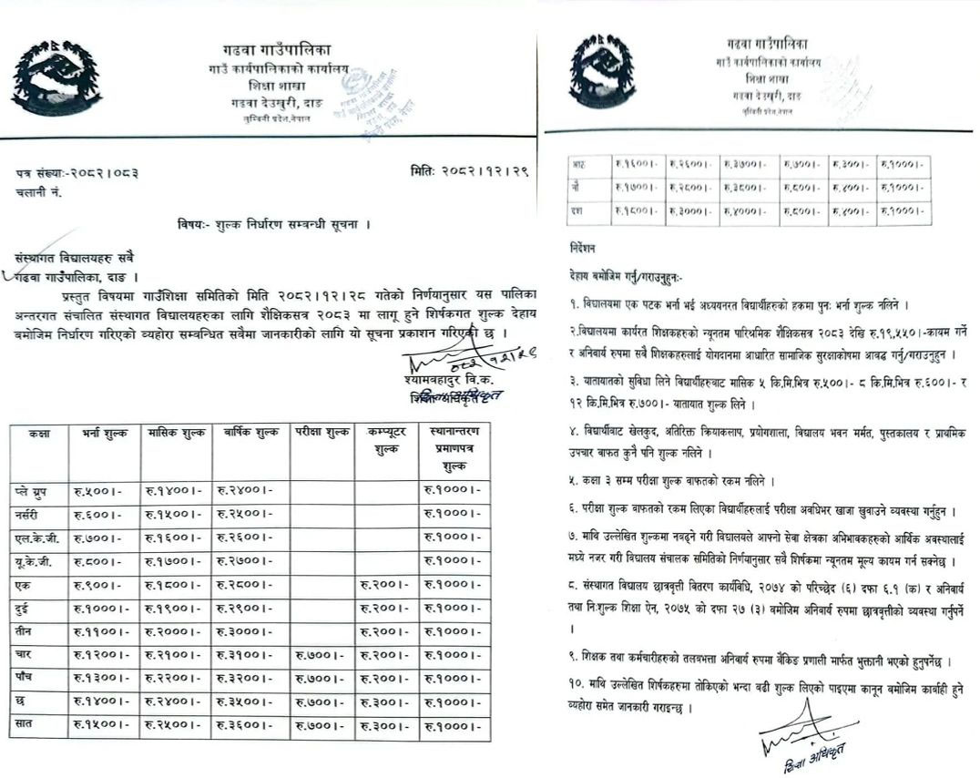 दाङ- गढवा गाउँपालिकाले शैक्षिक सत्र २०८३ का लागि संस्थागत (निजी) विद्यालयले लिने शुल्क निर्धारण गरेको छ। गाउँ शिक्षा समितिको आइतबार (चैत २८ गते) को निर्णयअनुसार शुल्कसम्बन्धी नयाँ व्यवस्था लागू गरिएको हो।
