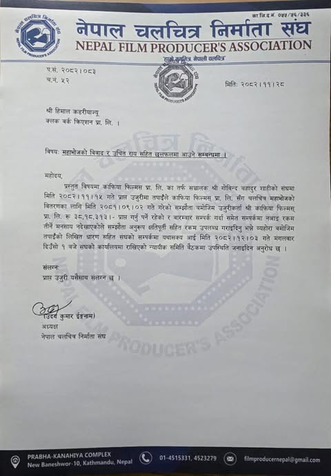 सम्झौता पूरा गर्न निर्माता कडरियालाई पटकपटक बोलाएको तर सम्पर्कमा नआएको पत्रमा लेखिएको छ।
