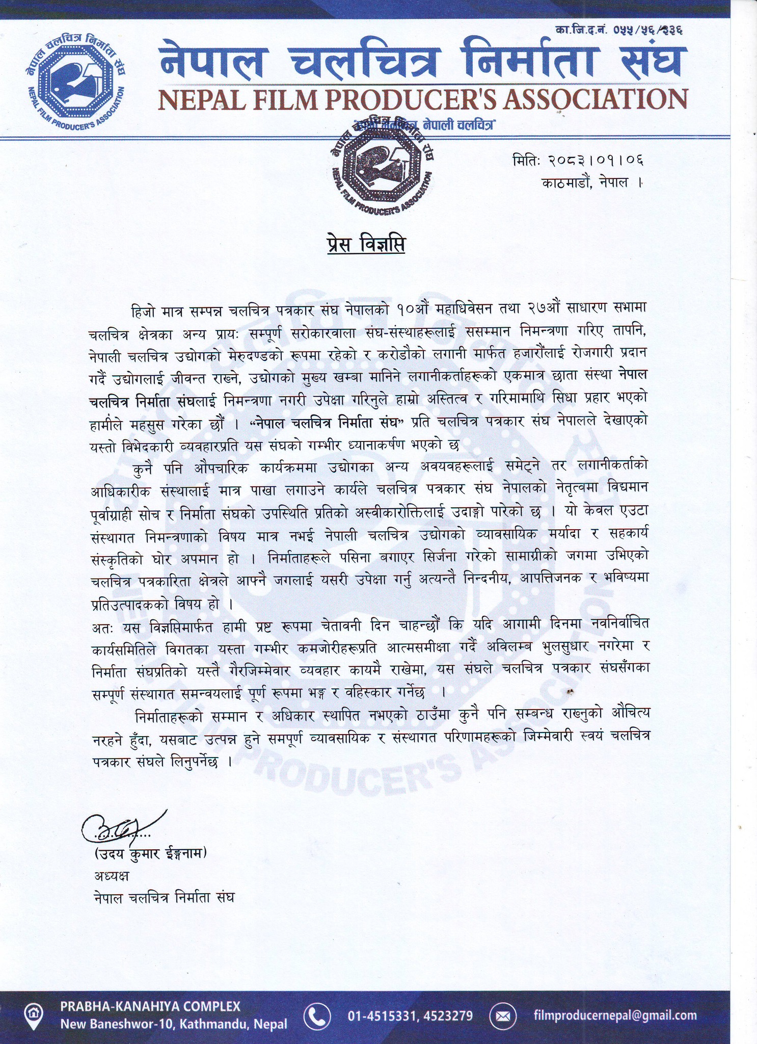 नेपाल चलचित्र निर्माता संघका अध्यक्ष उदय कुमार ईङ्नामद्वारा मंगलबार जारी विज्ञप्तिमा चलचित्र केवल मनोरञ्जनको साधन मात्र नभई विचार र अभिव्यक्तिको स्वतन्त्रताको सशक्त माध्यम भएको उल्लेख गरिएको छ।