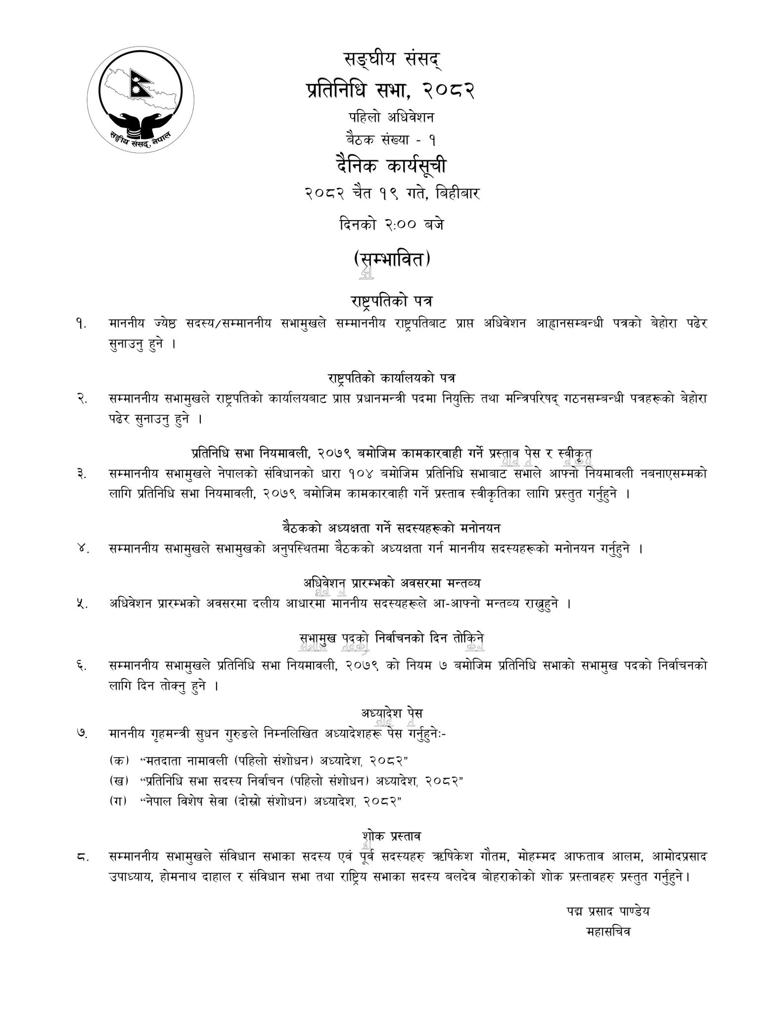 संसद सचिवालयले पहिलो अधिवेशनअन्तर्गत बिहीबार बस्न लागेको प्रतिनिधिसभाको पहिलो बैठकको सम्भावित कार्यसूची सार्वजनिक गरेको हो।