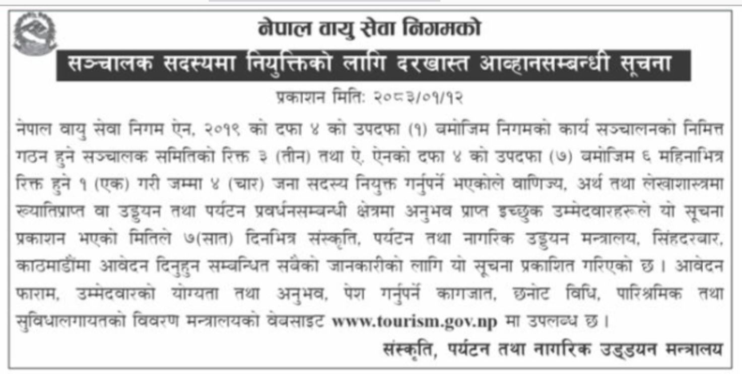 काठमाडौँ- संस्कृति, पर्यटन तथा नागरिक उड्डयन मन्त्रालयले नेपाल वायुसेवा निगमको रिक्त चार सञ्चालक सदस्य पदपूर्तिका लागि दरखास्त आह्वान गरेको छ। मन्त्रालयले खुला प्रतिस्पर्धाका माध्यमबाट यी पदहरू भर्नका लागि सार्वजनिक सूचना जारी गरेको हो।