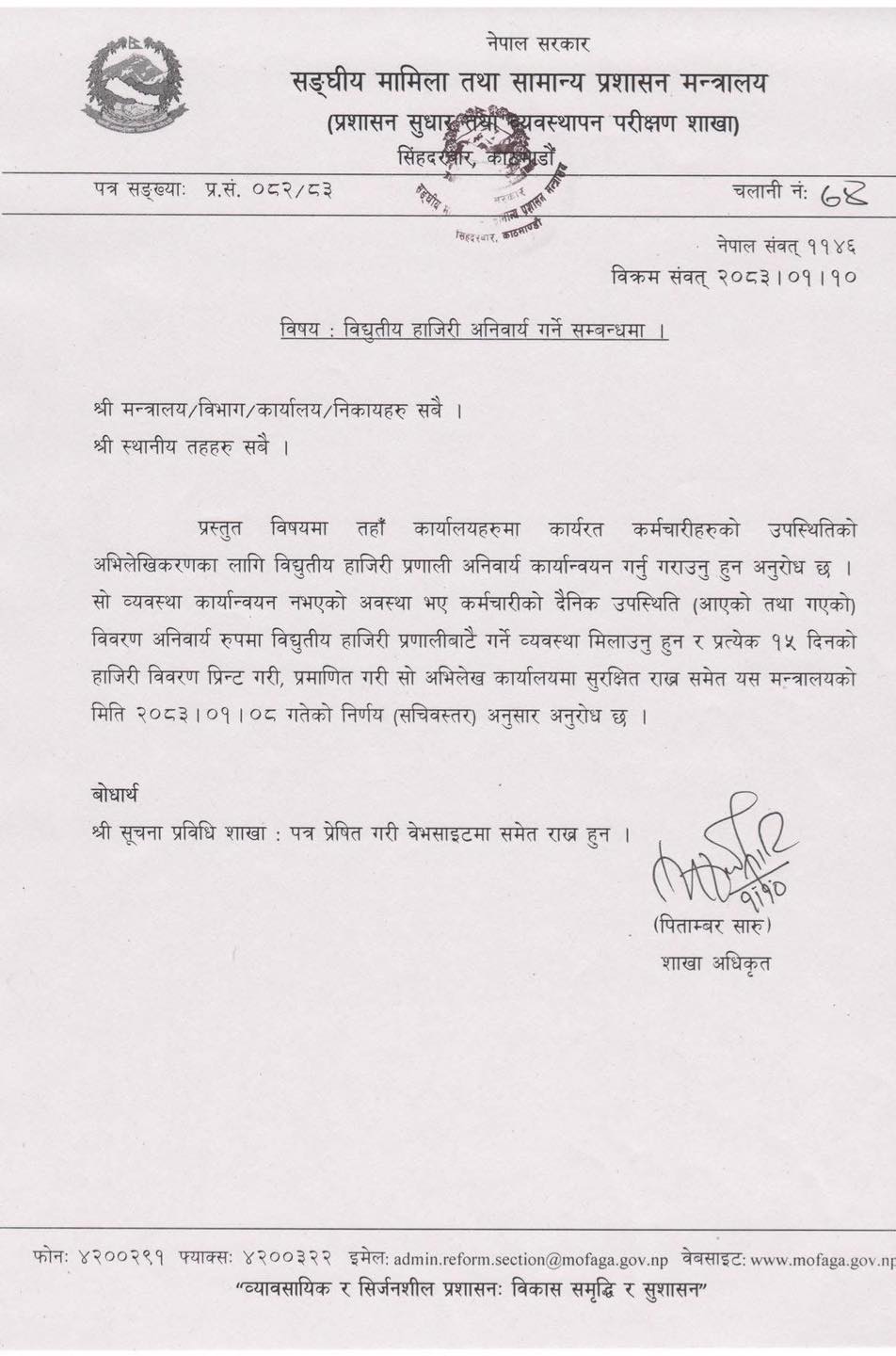 मन्त्रालयको प्रशासन सुधार तथा व्यवस्थापन परीक्षण शाखाबाट जारी पत्रअनुसार अब मन्त्रालय, विभाग, कार्यालय तथा सबै स्थानीय तहमा कार्यरत कर्मचारीको दैनिक उपस्थितिको विवरण (आएको र गएको समय) अनिवार्य रूपमा विद्युतीय प्रणालीबाटै अभिलेख राख्नुपर्नेछ।