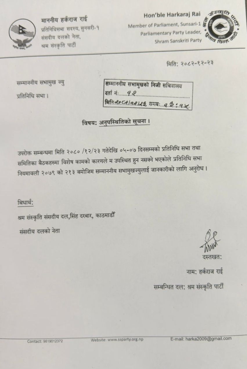काठमाडौँ- श्रम संस्कृति पार्टीका संसदीय दलका नेता तथा प्रतिनिधिसभा सदस्य हर्कराज राई आगामी एक साता संसद् बैठकमा अनुपस्थित हुने भएका छन्। सुनसरी निर्वाचन क्षेत्र नम्बर १ बाट निर्वाचित सांसद राईले विशेष कामको कारण देखाउँदै संसद् सचिवालयलाई आफ्नो अनुपस्थितिको जानकारी गराएका हुन् ।
