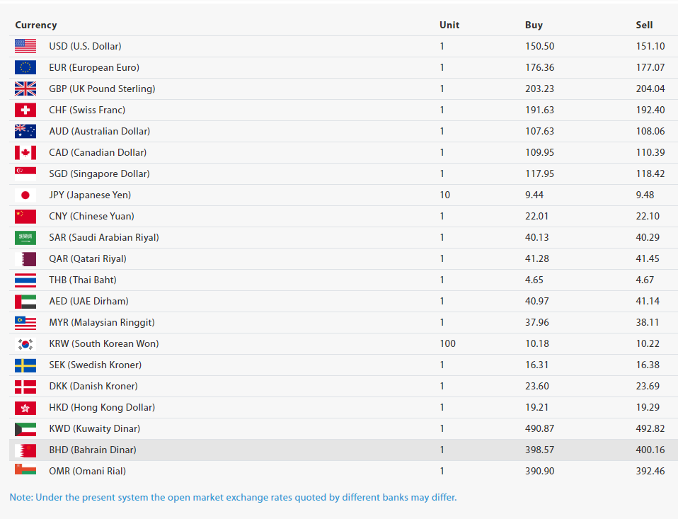 काठमाडौँ- नेपाल राष्ट्र बैंकले आज (आइतबार) का लागि विदेशी मुद्राहरूको विनिमयदर निर्धारण गरेको छ। आज अमेरिकी डलर, अस्ट्रेलियन डलर, युरो, पाउन्ड, कुवेती र बहराइन दिनारसहित सबैजसो विदेशी मुद्राको विनिमयदर हिजोकै मूल्यमा स्थिर छ। हिजो सबैजसो मुद्राको विनिमयदर बढेको थियो। आज अमेरिकी डलर १ को खरिददर १५० रुपैयाँ ५० पैसा र बिक्रीदर १५१ रुपैयाँ १० पैसा छ। हिजो पनि अमेरिकी डलरको विनिमयदर यही थियो।