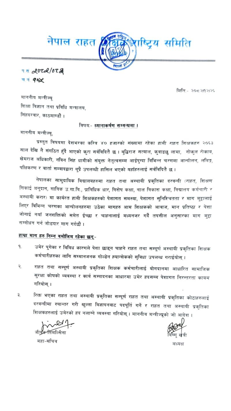 पत्रमा सामुदायिक विद्यालयमा कार्यरत राहत, अस्थायी, अनुदान, प्राविधिक धार, विशेष कक्षा, बालविकास तथा विद्यालय कर्मचारीहरूको पेसागत असुरक्षा कायमै रहेको उल्लेख गरिएको छ। उनीहरूले आफ्नो मान प्रतिष्ठा र पेसागत सुनिश्चितता कायम गर्न तत्काल ठोस निर्णय गर्न सरकारसँग माग गरेका छन्।