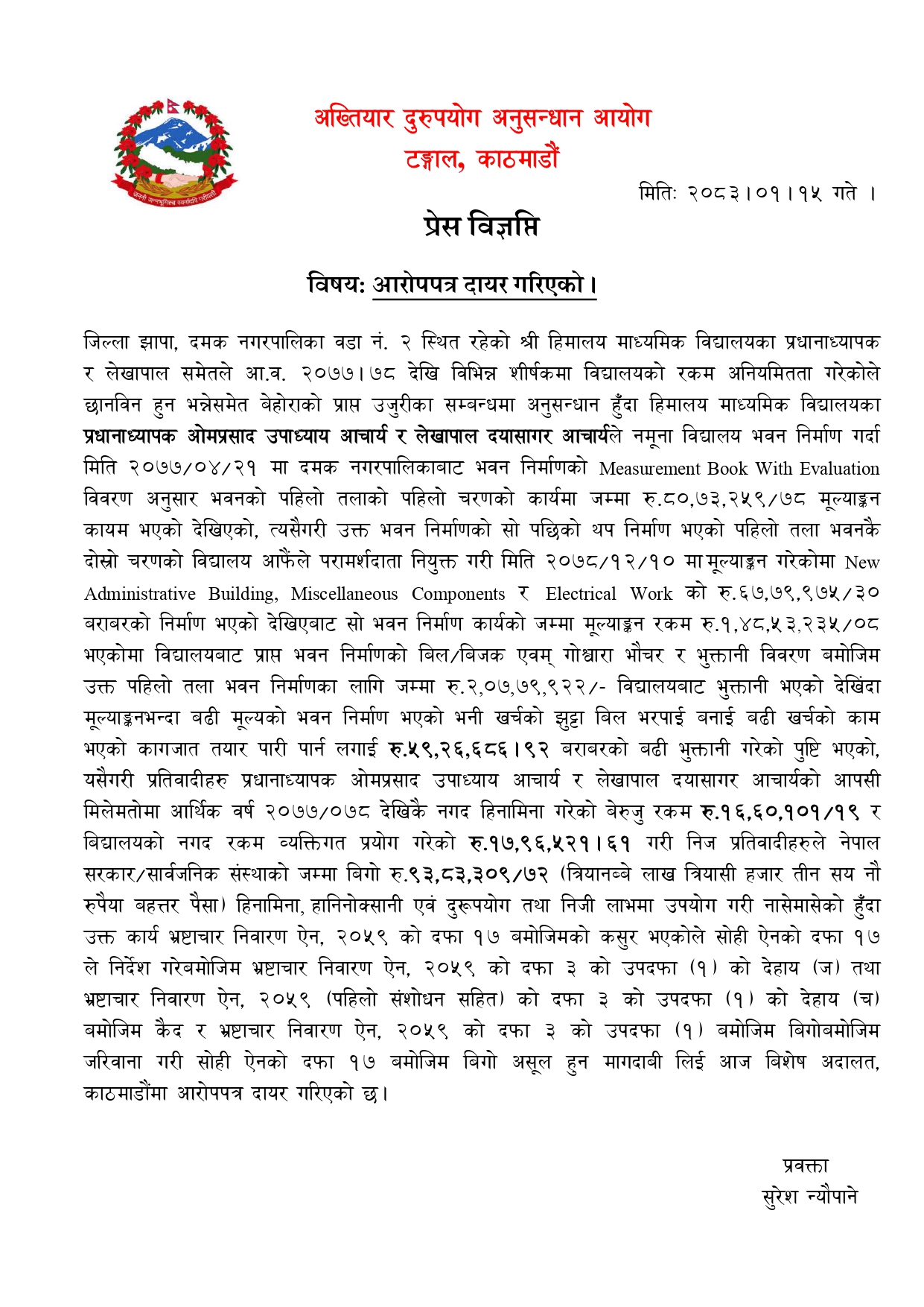 काठमाडौँ-अख्तियार दुरुपयोग अनुसन्धान आयोगले झापाको दमकस्थित हिमालय माध्यमिक विद्यालयमा भएको आर्थिक अनियमितता प्रकरणमा प्रधानाध्यापक र लेखापालविरुद्ध मुद्दा दायर गरेको छ।