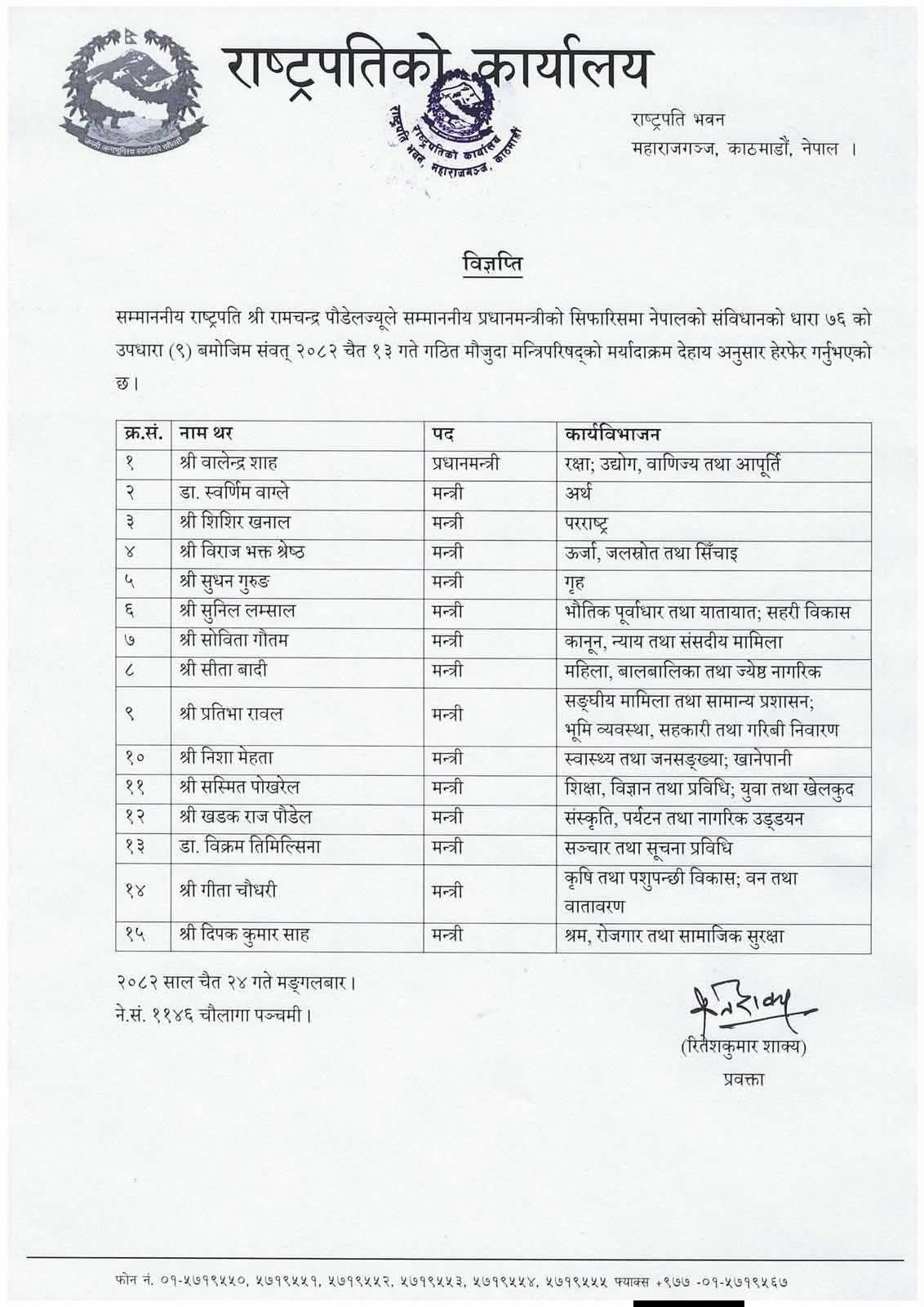 श्रम, रोजगार तथा सामाजिक सुरक्षामन्त्री दीपक कुमार साह पन्ध्रौं स्थानमा रहेको राष्ट्रपति कार्यालयले जनाएको छ।