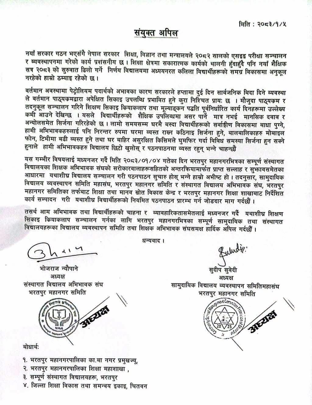 संस्थागत विद्यालय अभिभावक संघ भरतपुर महानगर समितिका अध्यक्ष भोजराज न्यौपाने र सामुदायिक विद्यालय व्यवस्थापन समिति महासंघका अध्यक्ष सुदीप सुवेदीले हस्ताक्षर गरेको अपिलमा शिक्षा तथा मानव स्रोत विकास केन्द्र र महानगरको शिक्षा शाखाले आवश्यक समन्वय गरी छिटो पठनपाठन सुरु गर्न आग्रह गरिएको छ।