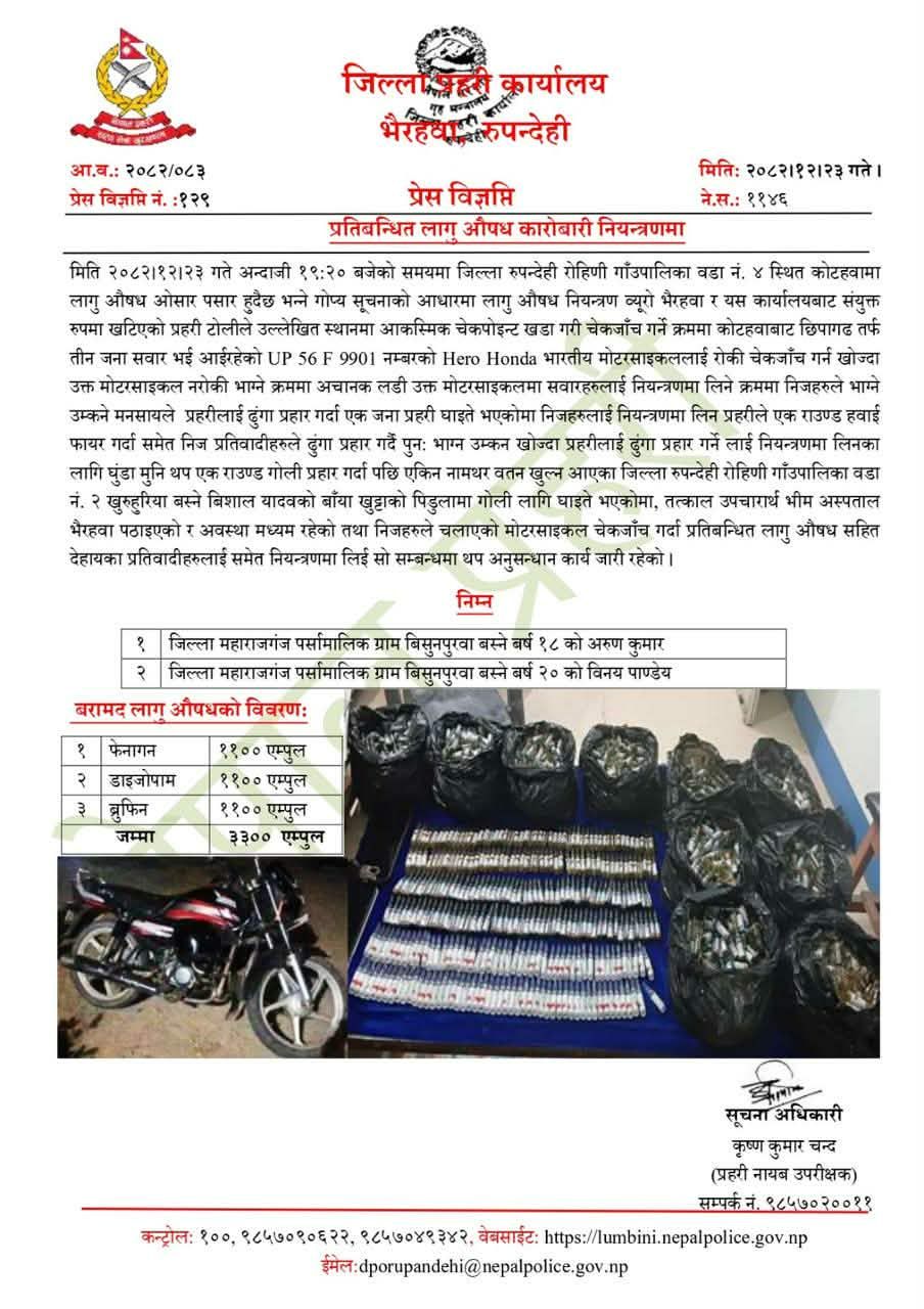उक्त घटनामा भारतको महाराजगंज जिल्ला पर्सामालिक ग्राम बिसुनपरवाका १८ वर्षीय अरुण कुमार र २० वर्षीय विनय पाण्डेयलाई नियन्त्रणमा लिइएको प्रहरीले जनाएको छ । उनीहरूको साथबाट फेनागन ११०० एम्पुल, डाइजोपाम ११०० एम्पुल र ब्रुफिन ११०० एम्पुल बरामद गरिएको प्रहरीले जानकारी दिएको छ । घटनाबारे थप अनुसन्धान भइरहेको प्रहरीले जानकारी दिएको छ ।