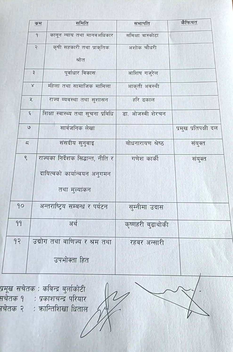 यस्तै, अन्तर्राष्ट्रिय सम्बन्ध तथा पर्यटन समितिको सभापतिमा सुम्निमा उदास, अर्थ समितिको सभापतिमा कृष्णहरि बुढाथोकी र उद्योग, वाणिज्य तथा श्रम तथा उपभोक्ता हित समितिको सभापतिमा रहवर अन्सारी चयन भएका छन्।