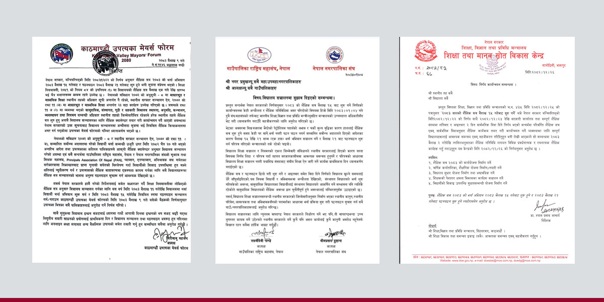 काठमाडौँ उपत्यकाभित्रका स्थानीय तहले आगामी शैक्षिक सत्र २०८३ को विद्यार्थी भर्ना अभियान वैशाख ११ गतेदेखि र नियमित पठनपाठन वैशाख १५ गतेदेखि नै सुरु गर्ने निर्णय गरेका छन्। उपत्यका मेयर्स फोरमले संघीय सरकारको पछिल्लो निर्देशनले शैक्षिक क्षेत्रमा अन्योल उत्पन्न गरेको निष्कर्ष निकाल्दै स्थानीय सरकारको अधिकार प्रयोग गरी आफ्नै कार्यतालिका सार्वजनिक गरेको हो।