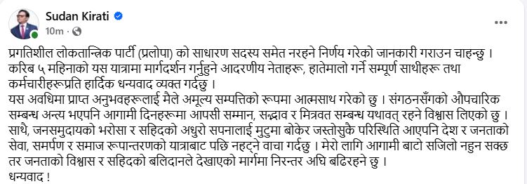 काठमाडौँ- प्रगतिशिल लोकतान्त्रिक पार्टी (प्रलोपा)का नेता सुदन किरातीले औपचारिकरूपममै पार्टी छाडेका छन्। उनले सामाजिक सन्जालमार्फत आफूले साधारण सदस्यबाट पनि राजीनामा दिएको बताएका छन्। उनले करिब ५ महिना काम गरेको र यस यात्रामा सहयोग गर्ने सबैप्रति धन्यवाद व्यक्त गरेका छन्।