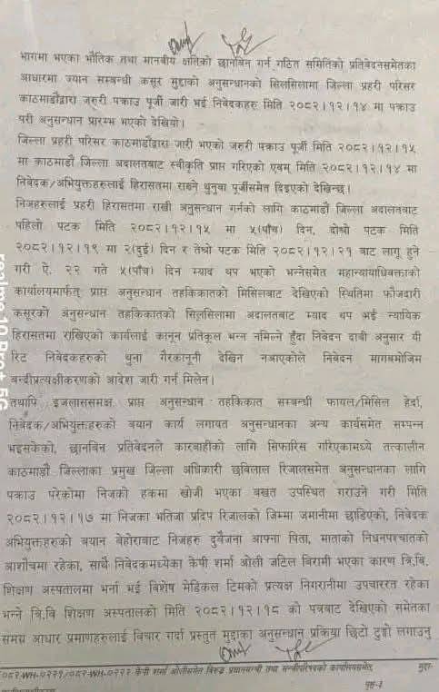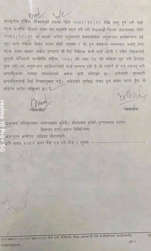 ‘चैत २१ गतेदेखि लागूहुने गरी तेस्रोपटक पाँच दिनको म्याद थप अनुमति गर्ने गरी काठमाडौँ जिल्ला अदालतबाट भएको आदेशअनुसारको समयअवधिमा अनुसन्धान कार्य सम्पन्न भई मुद्दा चल्ने वा नचल्ने निर्णय भएमा सोहीअनुसार र सो हुन नसकेमा तत्पश्चात अर्थात तेस्रोपटक थपिएको म्याद थपको अवधि उपरान्त यी रिट निवेदक केपी शर्मा ओली र रमेश लेखकलाई…प्रक्रिया पूरा गरी हिरासतमुक्त गरी थप अनुसन्धान तहकिकातको कार्य सम्पन्न गरी जे जो गर्नुपर्ने हो गर्नु गराउनु भनी परमादेश जारी गरिएको छ,’ आदेशमा भनिएको छ।