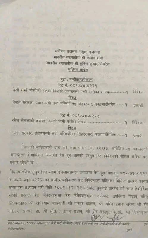 सर्वोच्च अदालतले दुवै जनाको बन्दीप्रत्यक्षीकरण रिट भने खारेज गरेको छ। गैरकानुनी पक्राउ गरेको भन्दै ओलीकी पत्नी राधिका शाक्य र लेखककी पत्नी यशोधा लेखकले बन्दीप्रत्यक्षीकरण रिट दायर गरेकी थिइन्।