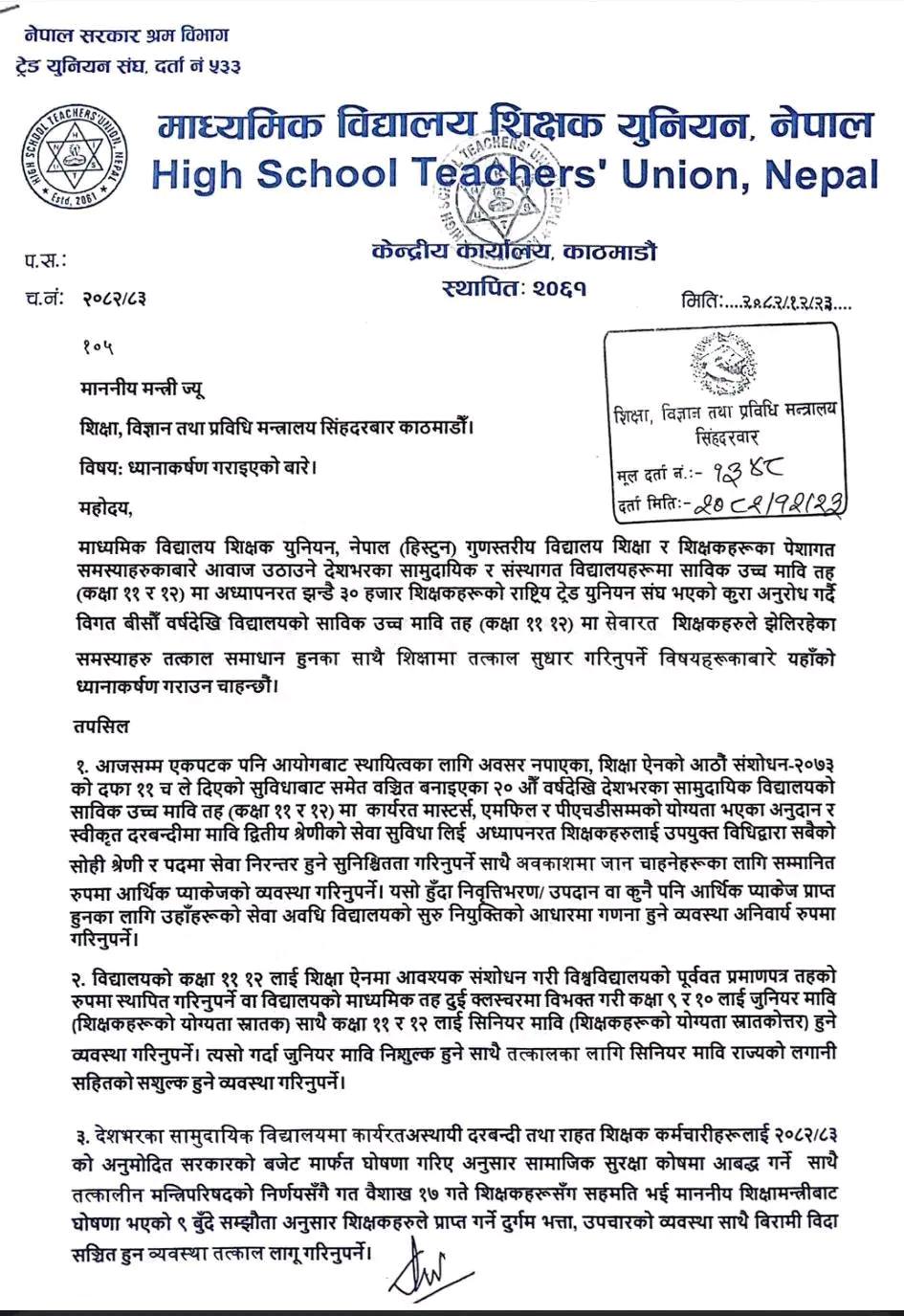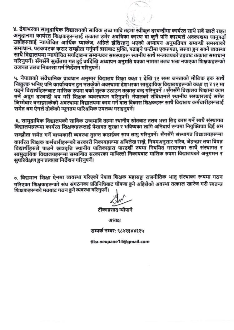 पत्रमा दीर्घकालीन सेवा गरेका शिक्षकका लागि सम्मानजनक अवकाश प्याकेजको व्यवस्था गर्नुपर्ने, सेवा अवधिको गणना सुरु नियुक्तिबाटै हुनुपर्ने जस्ता मागहरू उल्लेख छन्।
