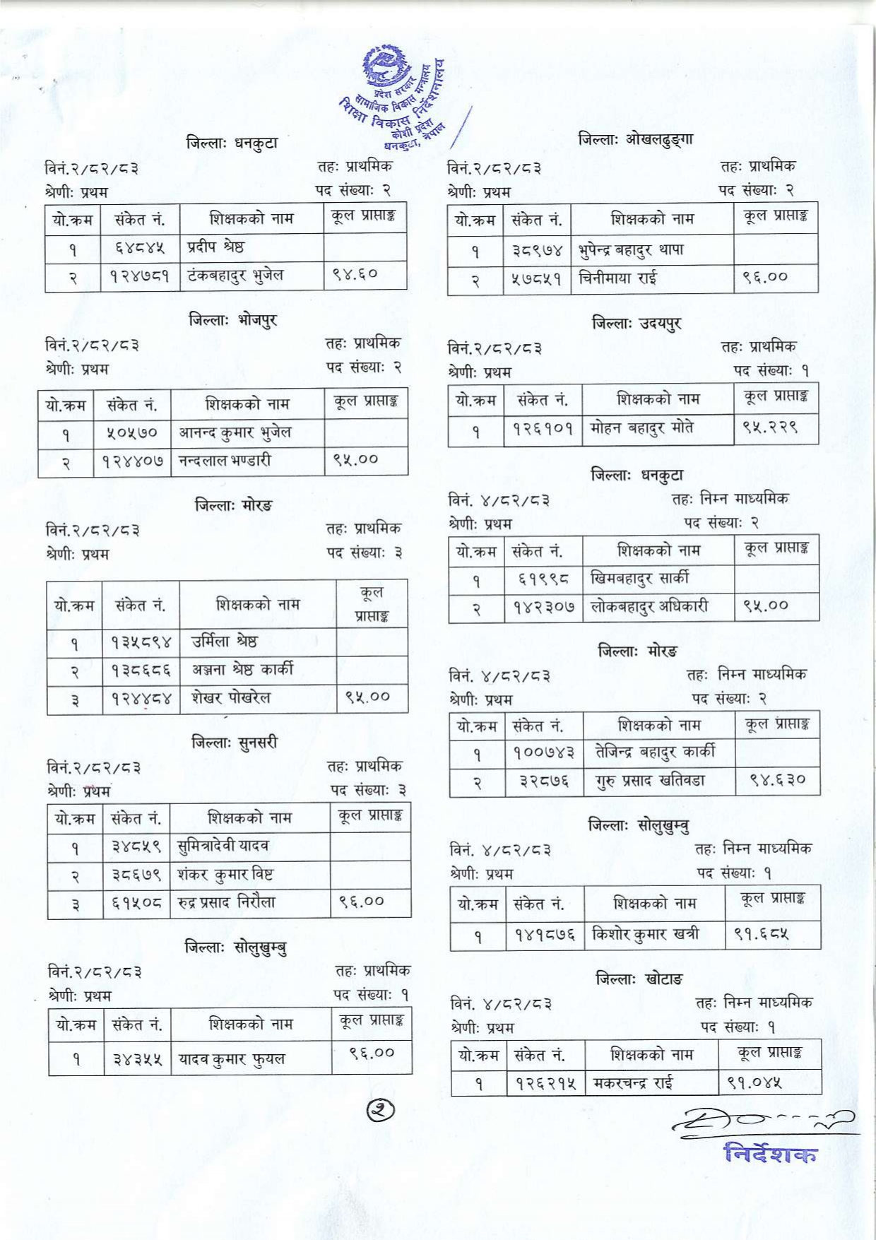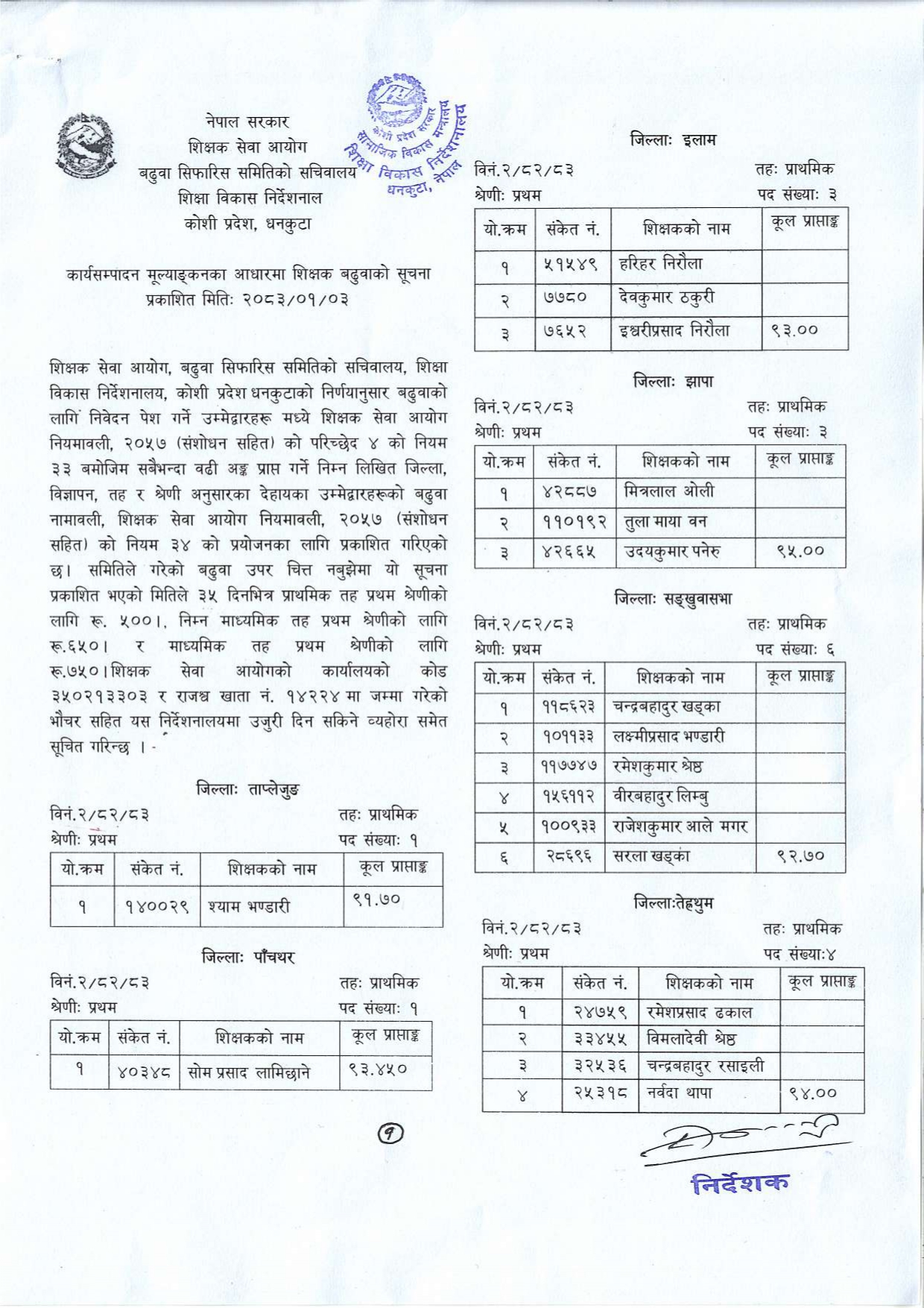 निर्देशनालयको निर्णयअनुसार बढुवाका लागि निवेदन दिएका उम्मेद्वारहरूमध्ये शिक्षक सेवा आयोग नियमावली २०५७ (संशोधन सहित) को नियम ३३ बमोजिम सबैभन्दा बढी अंक प्राप्त गर्ने उम्मेद्वारहरूको जिल्ला, विज्ञापन, तह तथा श्रेणी अनुसार नामावली प्रकाशित गरिएको हो। उक्त नामावली नियम ३४ को प्रयोजनका लागि सार्वजनिक गरिएको जनाइएको छ।