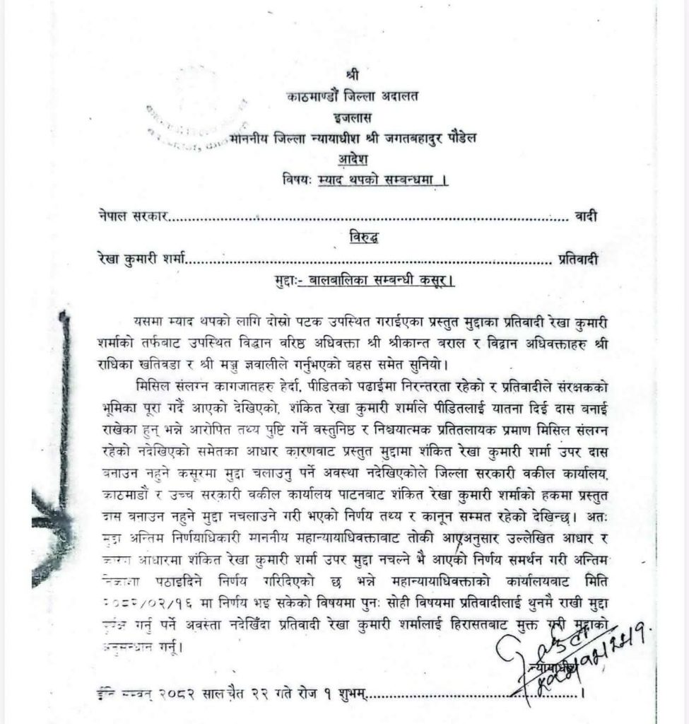 ‘…माननीय महान्यायाधिवक्ताबाट तोकी आएअनुसार उल्लेखित आधार र कारण आधारमा शंकित रेखाकुमारी शर्मा उपर मुद्दा नचल्ने भै आएको निर्णय समर्थन गरी अन्तिम निकाशा पठाइदिने निर्णय गरिदिएको छ भन्ने महान्यायाधिवक्ताको कार्यालयबाट मिति २०८२/२/१६ मा निर्णय भइसकेको विषयमा पुनः सोही विषयमा प्रतिवादीलाई थुनामै राखी मुद्दा पुर्पक्ष गर्नुपर्ने अवस्था नदेखिँदा प्रतिवादी रेखाकुमारी शर्मालाई हिरासतबाट मुक्त गरी मुद्दाको अनुसन्धान गर्नू,’ आदेशमा भनिएको छ।