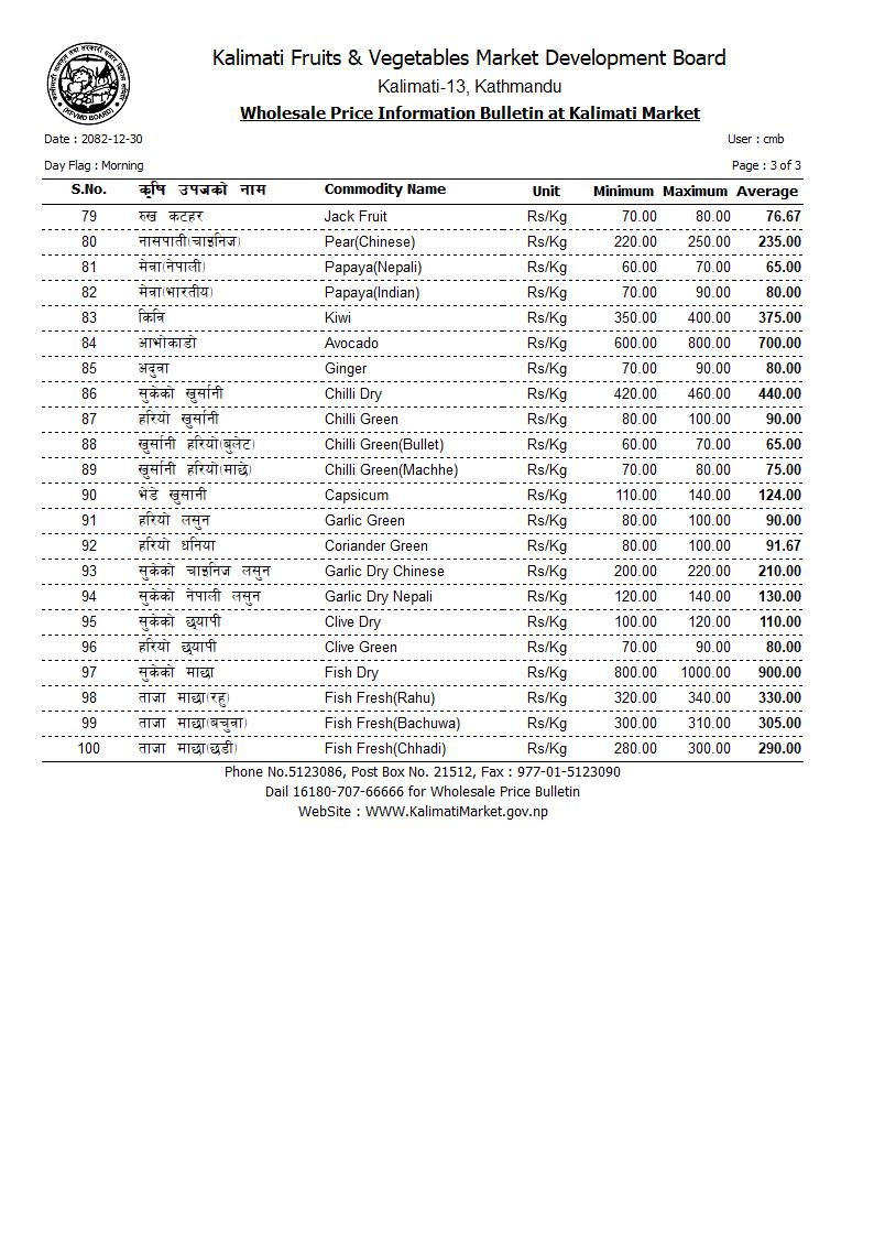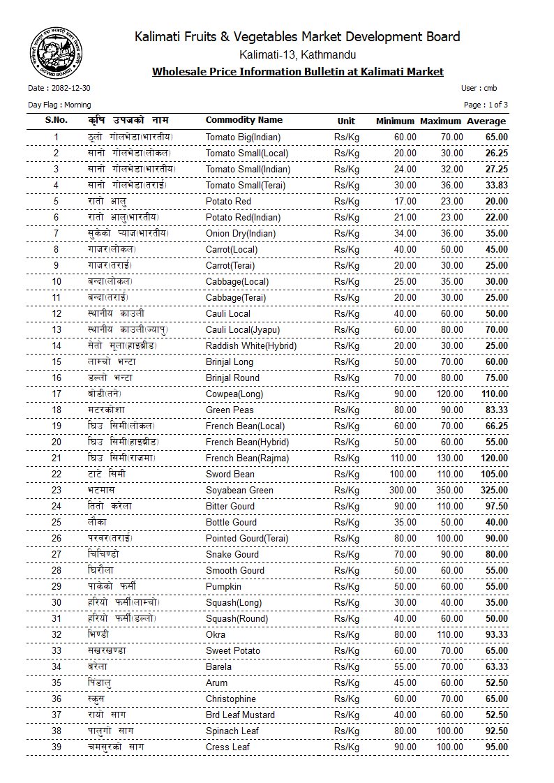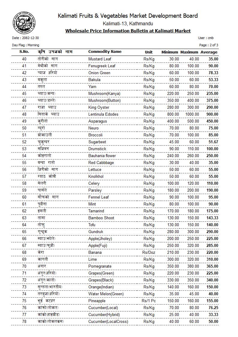 तनेबोडी ११०, करेला ८८, लौका ५५, घिरौँला ५०, परबल १०५, हरियो डल्ले फर्सी ३७, पाकेको फर्सी ५५, भिन्डी ९०, कन्य च्याउ २५०, डल्ले च्याउ ३८०, कुरिलो ३८३, न्यूरो ७५, ब्रोकाउली ७०, चुकन्दर ५५ रुपैयाँ प्रतिकिलो थियो।