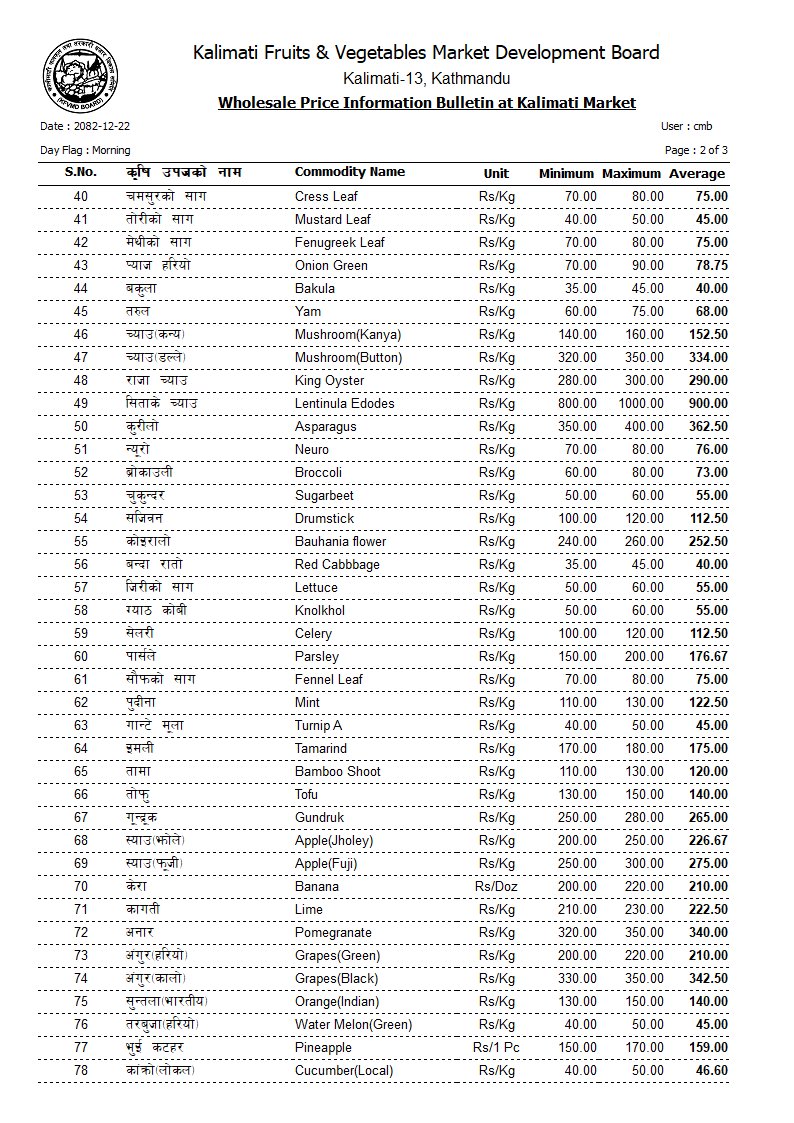 तनेबोडी ११३, करेला १५३, लौका ६१, घिरौँला ९०, तराईको परबल ९६, हरियो डल्ले फर्सी ३६, पाकेको फर्सी ५५, भिन्डी ११६, कन्य च्याउ १५२, डल्ले च्याउ ३३४, सिताके च्याउ ९००, कुरिलो ३६२, न्यूरो ७६, ब्रोकाउली ७३ रुपैयाँ प्रतिकिलो छ।