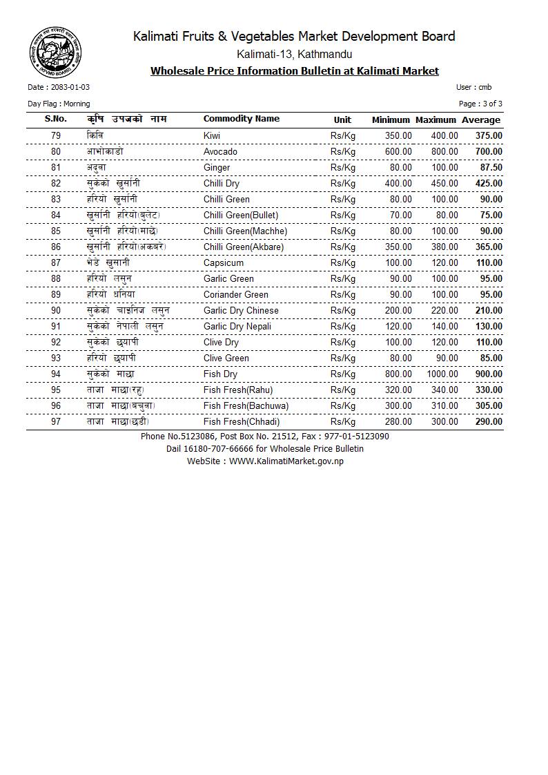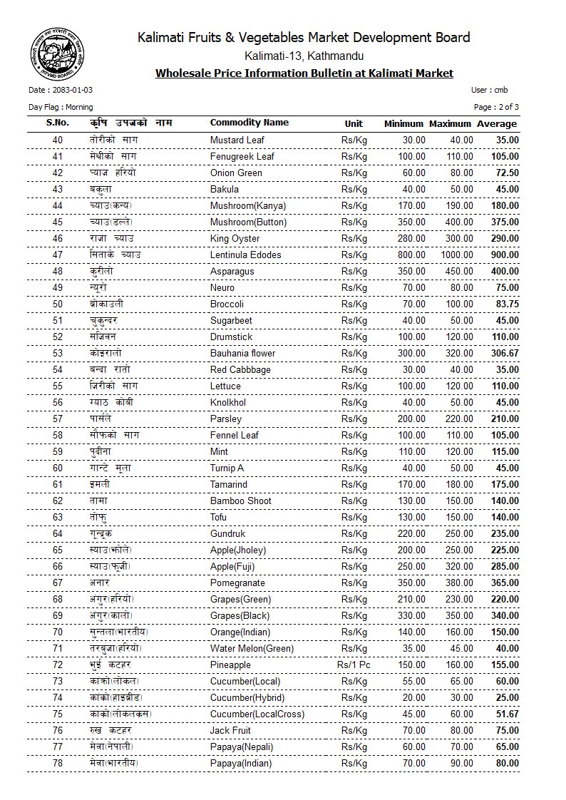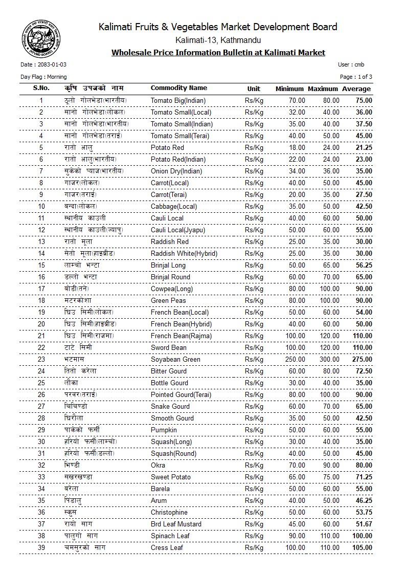 तनेबोडी ९०, लौका ३५, घिरौँला ४२, परबल ९०, हरियो डल्ले फर्सी ४५, पाकेको फर्सी ५५, भिन्डी ८०, कन्य च्याउ १८०, डल्ले च्याउ ३७५, कुरिलो ४००, न्यूरो ७५, ब्रोकाउली ८३, चुकन्दर ४५ रुपैयाँ प्रतिकिलो छ।